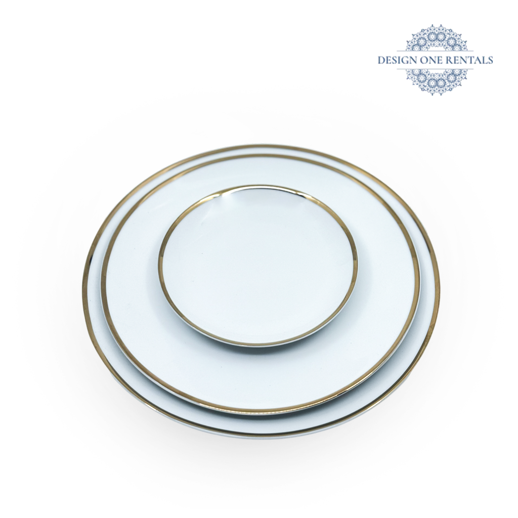 The Aimee Gold Collection Dinner Plate features a clean white surface accented by two refined gold bands for a polished, modern look. Ideal for weddings and formal events, it pairs well with our Two Tone Black and Champagne Collection flatware, Monte Carlo Gold Rim chargers, and Grace Clear Collection glassware.