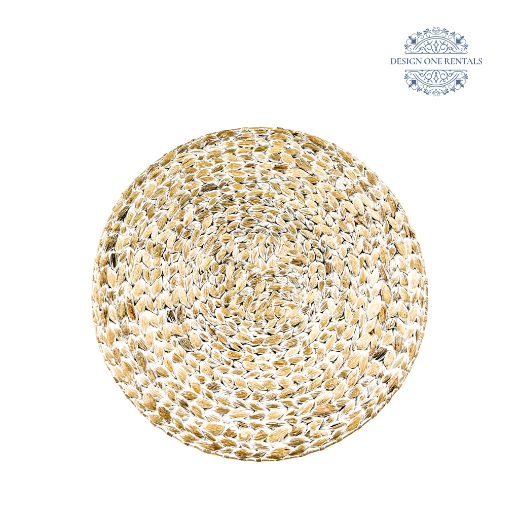 The Antique Bamboo Charger Plate features a round, handwoven design crafted from natural fibers in soft beige, tan, and white tones. Its tightly braided pattern adds rich texture and rustic charm, making it perfect for boho, tropical, or coastal-inspired events. Ideal for event planners and party rental setups, this charger plate brings an organic warmth to outdoor receptions, garden parties, or casual gatherings. Best paired with our Allora Champagne Collection for a natural and stylish tablescape.