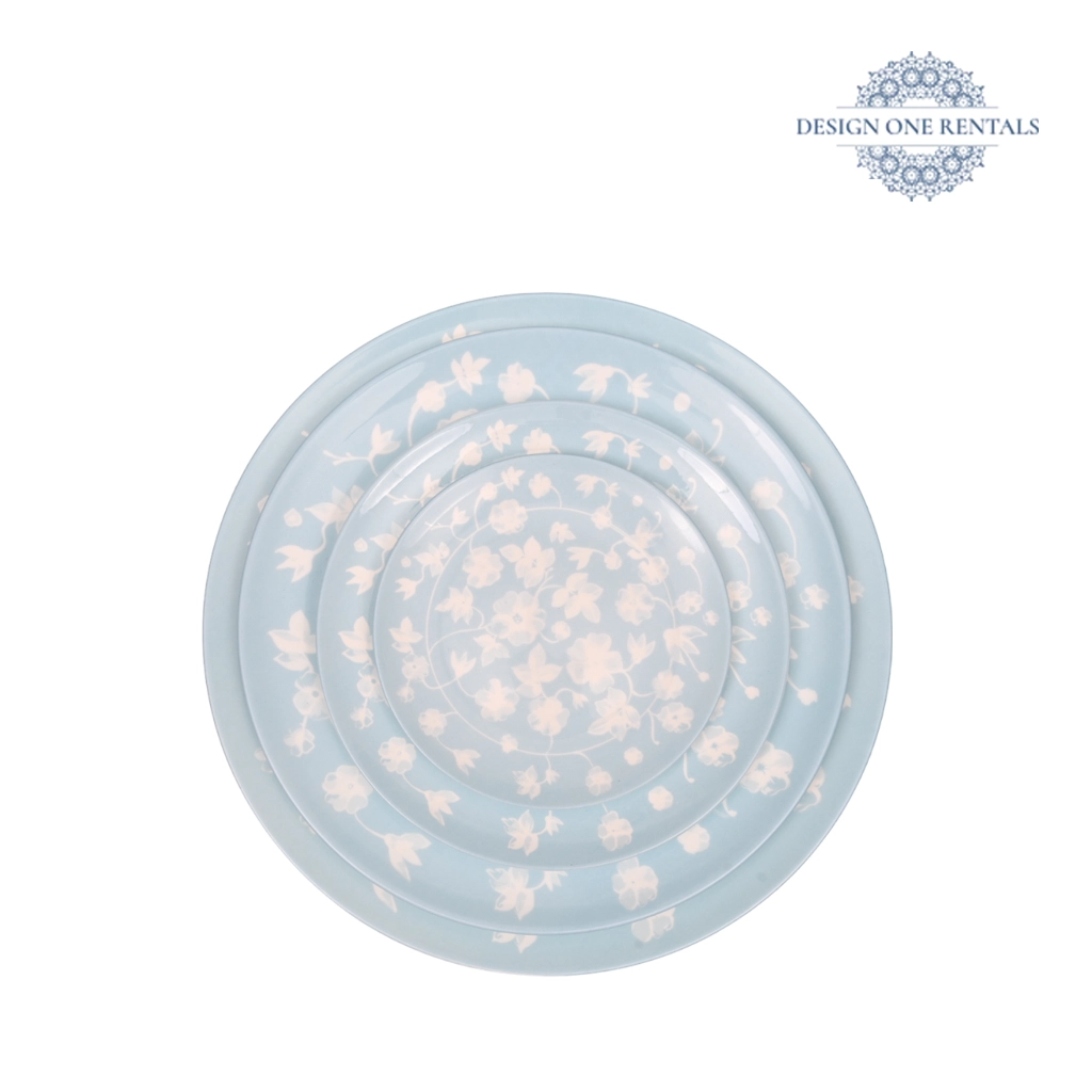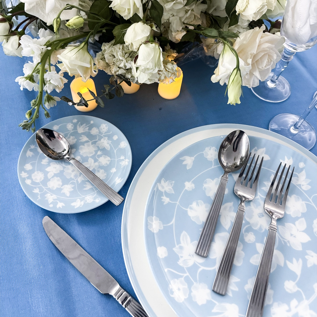 The Aria Light Blue China Plate features a soft powder-blue base adorned with airy white florals and trailing leaves arranged in a flowing, watercolor-style pattern. Its light, botanical design makes it a beautiful option for garden weddings, spring luncheons, bridal showers, and styled party rentals. Available in different sizes, this plate allows event planners to layer place settings with gentle color and visual interest. Pair it with our Ethan Brushed Gold Collection for a balanced table design.
