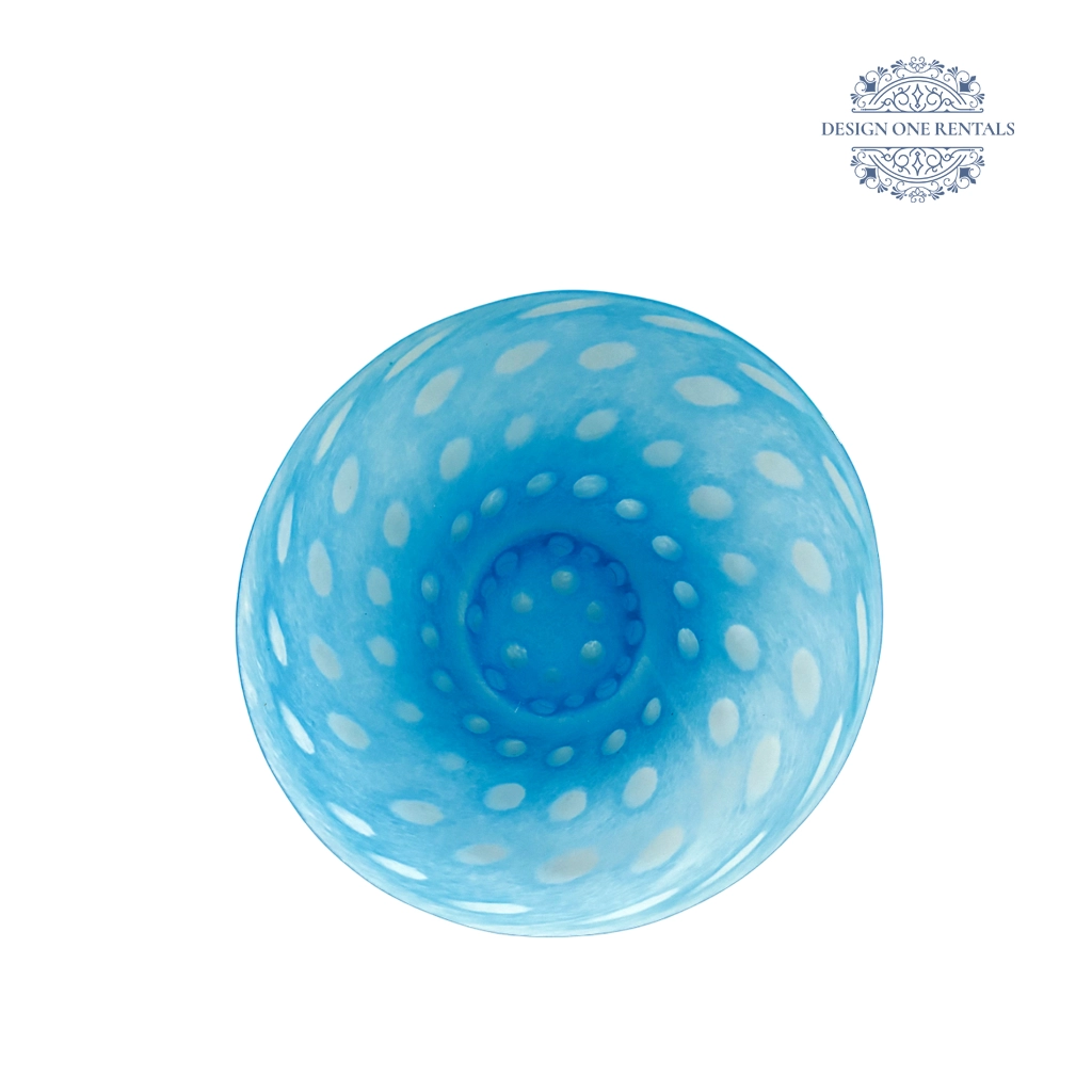 The Blue Circle China Plate features a striking frosted blue design with a deep azure center that softly fades toward a translucent edge. A playful spiral of white dot accents creates a bubble-like pattern, giving the plate a modern, artistic look with a handcrafted feel. Ideal for event planners styling contemporary dinners, winter-themed celebrations, or creative party rentals, this plate adds bold color and visual movement to the table. It pairs beautifully with Deco Collection.