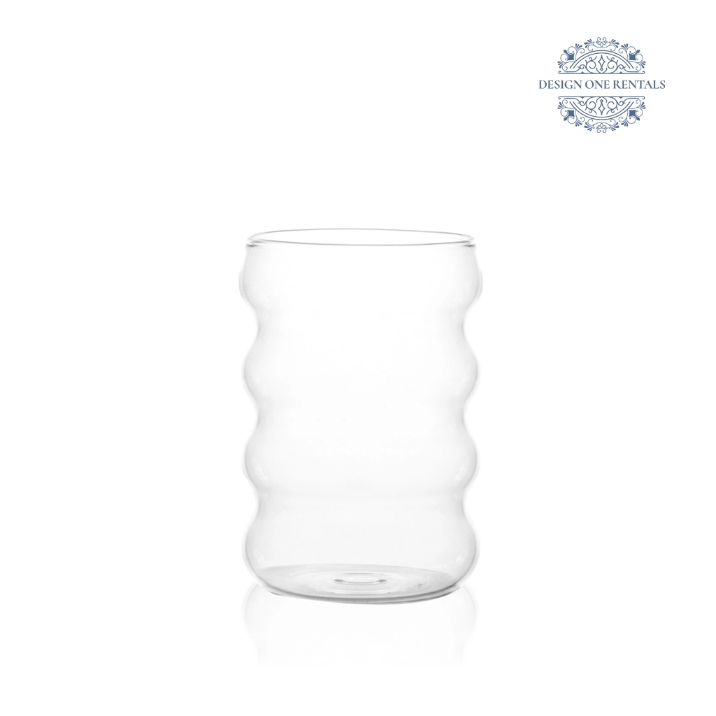 The Bubble Clear Glass features a rippled, stacked-bubble silhouette for a modern look, styled it with our Neutral Palm plates, Chloe Clear charger, and Two Tone Black and Champagne flatware for contemporary table settings and stylish events.