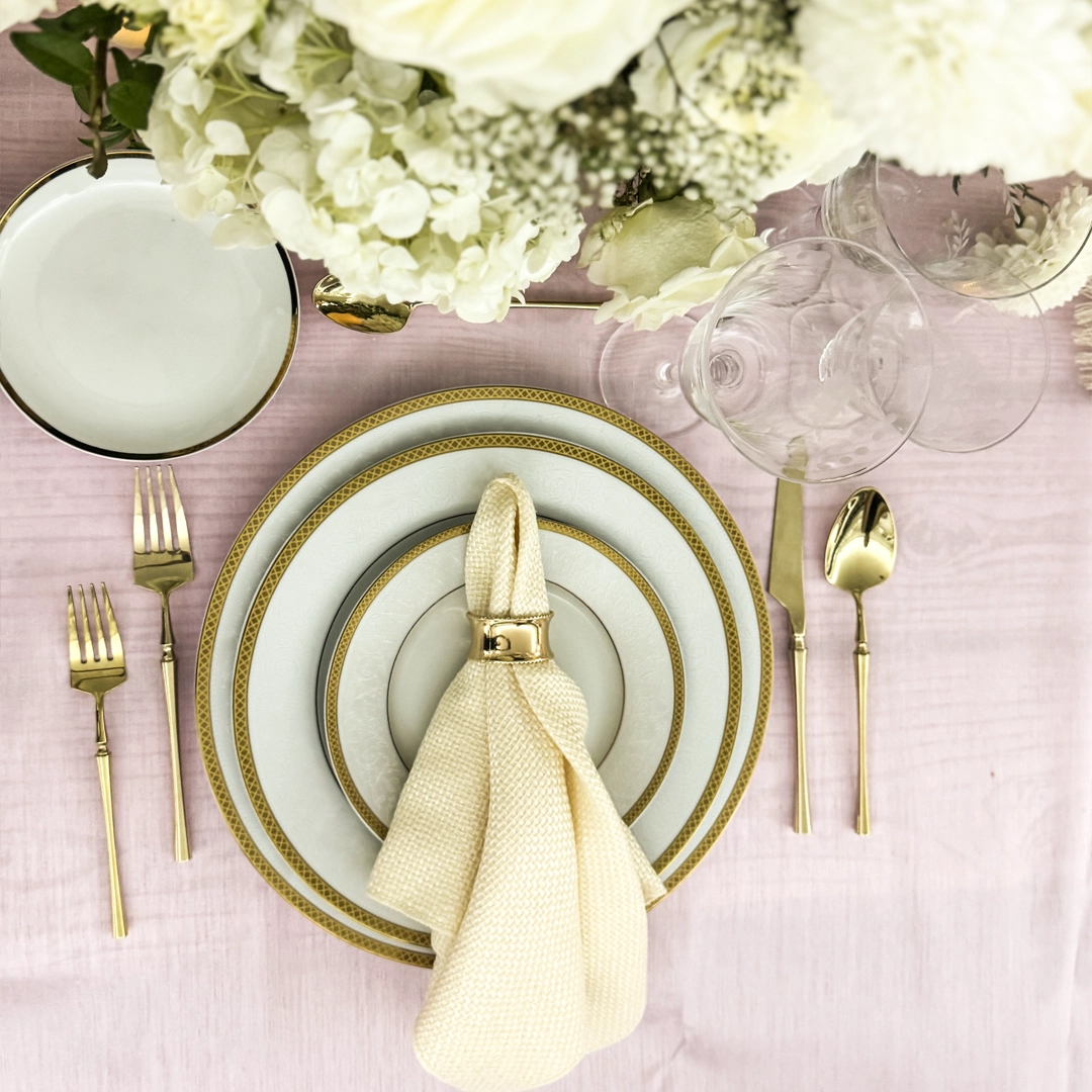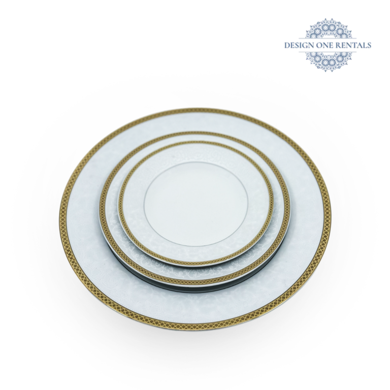 The Celine Gold China Set features a timeless white base highlighted with rich gold detailing, creating a luxurious and refined tabletop look. Ideal for party rentals and event planners, this collection suits weddings, formal dinners, and upscale celebrations. Available in multiple sizes, it allows for beautifully layered place settings that bring warmth and sophistication to any event. Pair it with our Ethan Brushed Gold Collection for a polished and coordinated presentation.