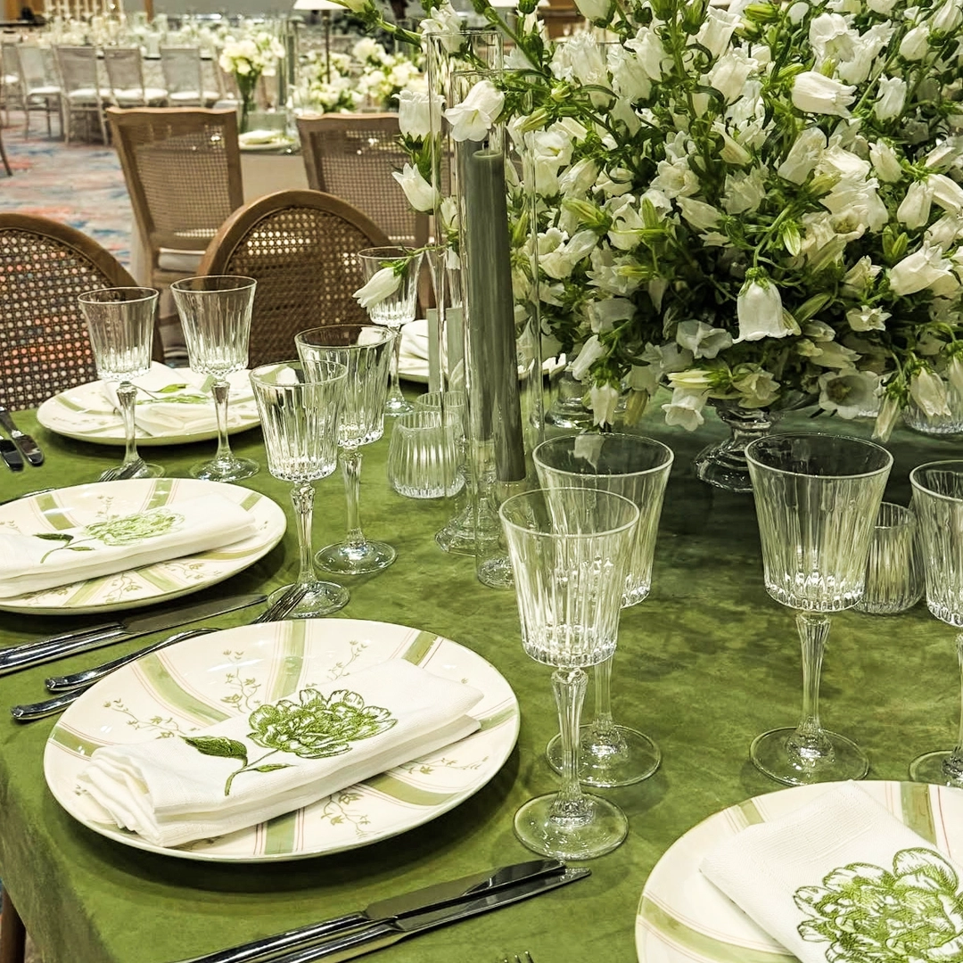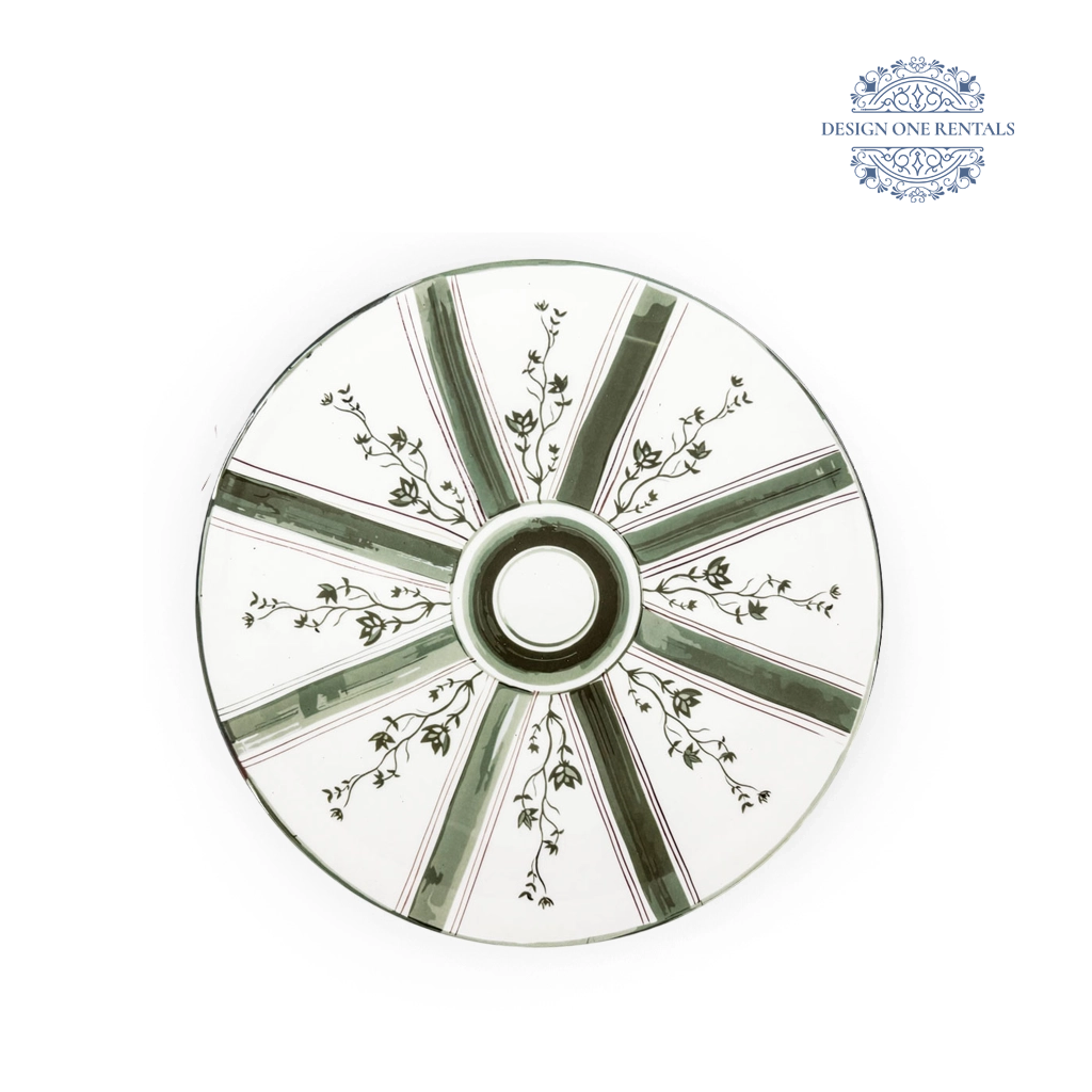 The Chantilly Verde Charger Plate features a white base adorned with radiating green stripes bordered by fine red lines and accented with intricate floral vine motifs. Its artistic detailing and fresh color palette bring a refined, nature-inspired charm to any event table. Perfect for garden weddings, spring celebrations, or elegant dinner parties, this charger adds a vibrant touch of artistry to your tablescape. Pair it beautifully with our Ethan Brushed Gold Collection for a polished look.