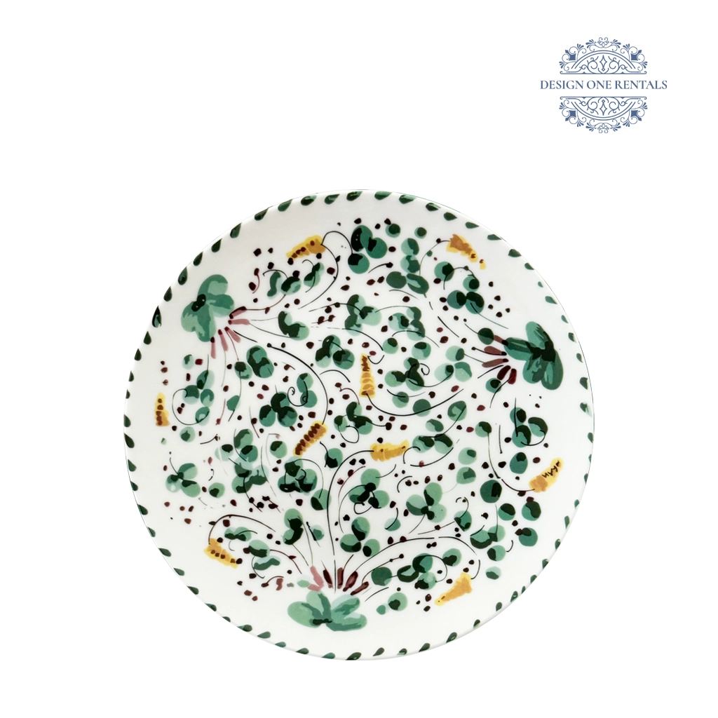 The Codi Green Charger Plate features a hand-painted floral design with vibrant green and golden-yellow accents on a crisp white base. Maroon details and a leafy green border add a touch of artistry, making it perfect for spring weddings, garden parties, or nature-inspired celebrations. Ideal for event planners and rental collections, this charger brings warmth and creativity to any tablescape. Pair it beautifully with our  Artisan Clear Collectionfor a refined yet lively presentation.