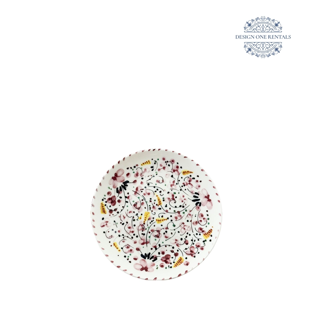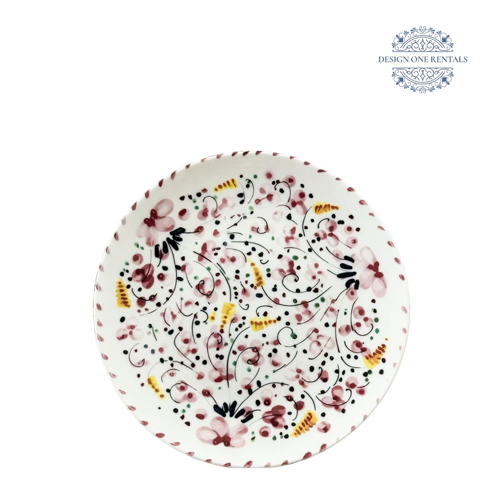 The Codi Red Collection Dinner Plate features a lively, hand-painted botanical design with pink blossoms, swirling black vines, and accents of golden yellow and deep green on a crisp white base. Finished with a dusty rose dashed rim, this plate adds color and personality to garden parties, spring events, and creative party rentals. Available in different sizes, it allows event planners to layer place settings with playful detail. Pair it with our Two Tone Black and Champagne Collection to complement its artistic look.