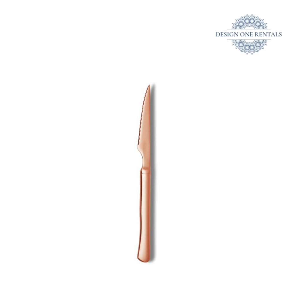The Copper Steak Knife features a sleek, brushed copper finish with a sharp, curved blade and balanced handle, ideal alongside modern Aria Pink Collection dinner plates, Aurora Copper Collection flatware, and Silver Rim charger plate for contemporary, high-fashion tablescapes.