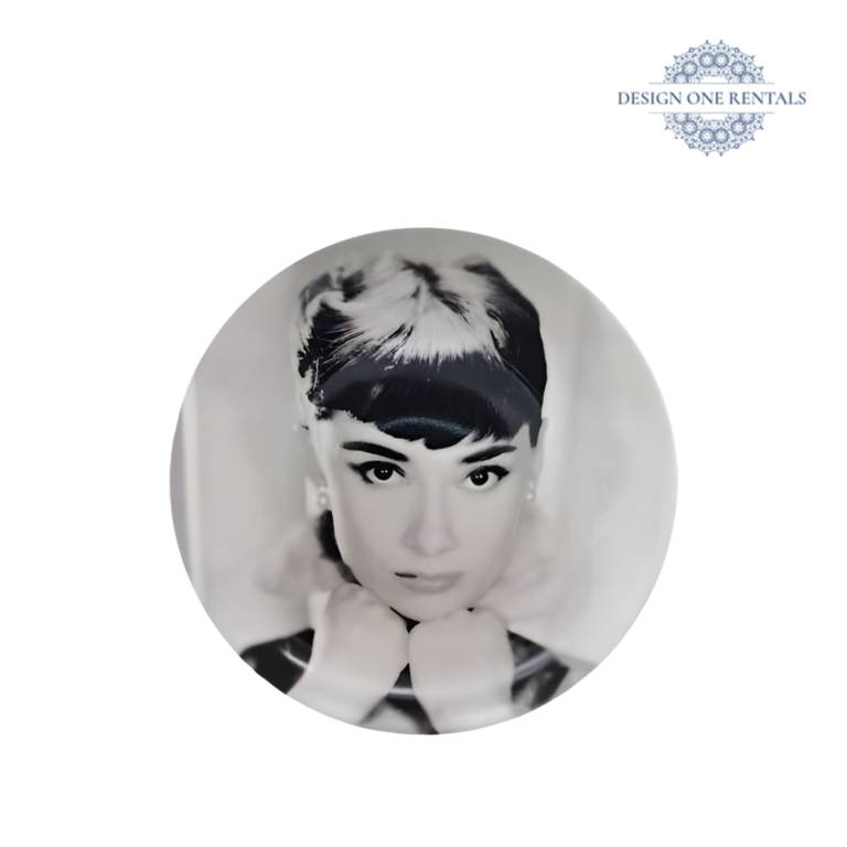The Duchess Faces III Dinner Plate features a bold black-and-white Hollywood portrait, perfect for modern events. Pair with our Thin Gold Rim charger and  Aurora Black Collection flatware for a striking tablescape.