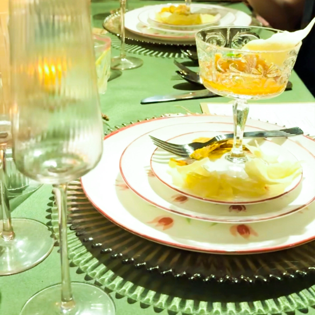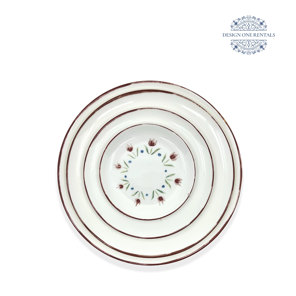 The Flora Collection Dinner Plate features a creamy white ceramic base accented with hand-painted terracotta rings that create a warm, structured frame for the table. Coordinating pieces highlight a delicate floral wreath motif with soft red tulip-style blooms and subtle blue berry details, adding a charming botanical touch. Ideal for garden-themed events, brunch receptions, and refined casual dining, this plate brings character without overpowering the tablescape. Available in multiple sizes, it pairs beautifully with our Ethan Brushed Gold Collection.