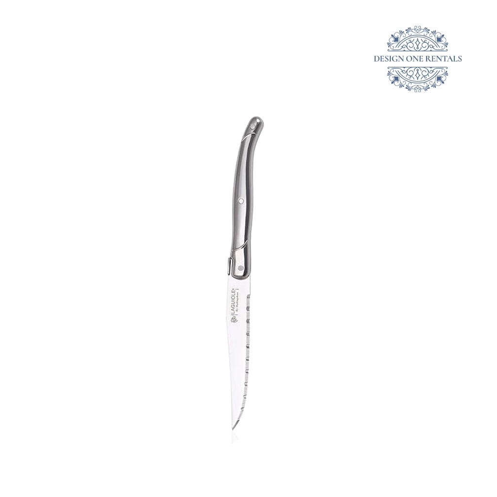 The Gaucho Steak Knife features a polished silver handle with an ergonomic curve and a high-performance serrated stainless steel blade, ideal for upscale dinners. It complements with our Excelsior dinner plate, and Medina Collection flatware sets for sophisticated table settings.