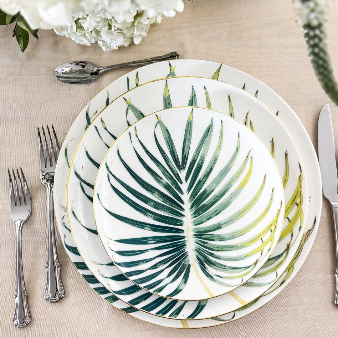 The Orchid 10-Inch China Plate features a bold tropical palm frond in shades of green on a crisp white background, accented with a delicate gold rim. Perfect for modern garden parties, tropical-themed weddings, and curated party rentals. Pair it with our Elyse glassware to complement the vibrant botanical design.