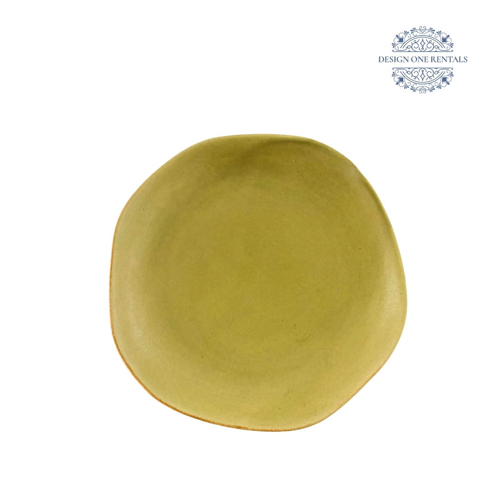 The Large Scallop 10-Inch China Plate features a muted olive green finish with a darker rim and an irregular, scalloped shape for a handcrafted, artisanal look. Perfect for rustic, garden, or bohemian-themed events and party rentals. Pair this with our Flori Natural to highlight its organic design.