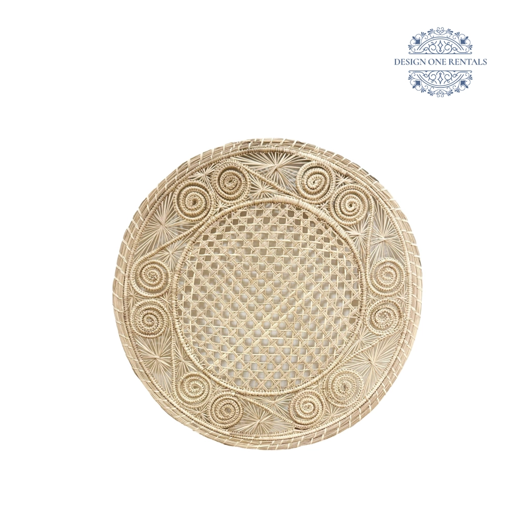 The Mirage Natural Charger Plate features a beautifully handwoven design made from natural fibers in soft beige tones, offering a refined organic aesthetic. Its circular and geometric patterns radiate from a detailed woven center, bringing depth and texture to any tablescape. Perfect for rustic weddings, coastal celebrations, or boho-inspired events, this charger plate adds warmth and artisanal style to your setting. Pair it with Sultan Collection for a naturally balanced look.