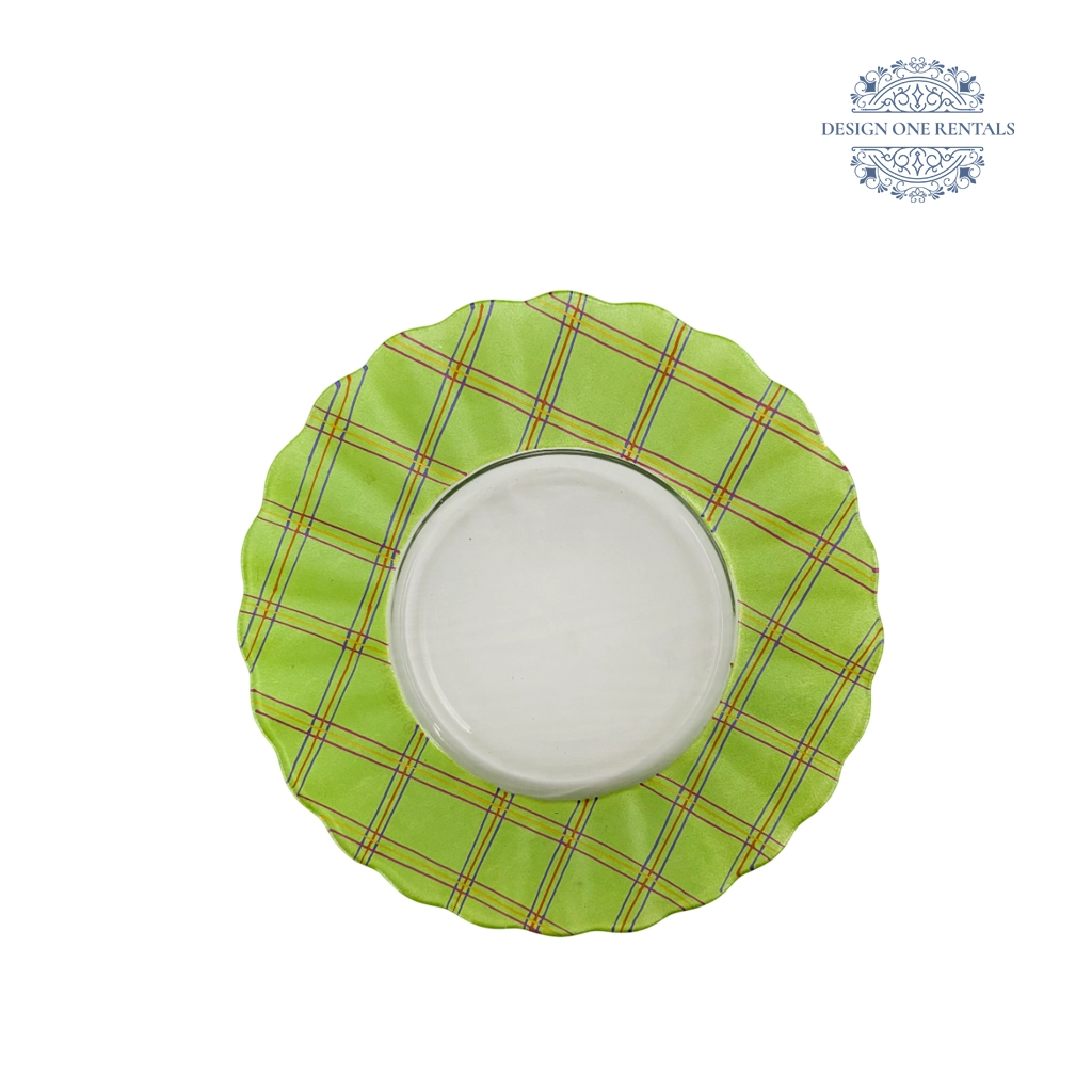 The Plaid Border Verde Charger Plate showcases a detailed woven texture with a natural, straw-like finish that exudes rustic charm and organic warmth. Its intricate plaid-inspired weave design makes it a stylish choice for boho weddings, garden receptions, or tropical-themed events. The handcrafted look adds depth and character to any tablescape, blending seamlessly with natural or outdoor décor. Best paired with our Vivi Brushed Gold Collection for a refined yet earthy presentation.