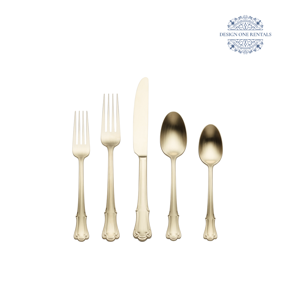The Allora Champagne Collection flatware features classic fiddle-style handles with soft champagne gold tones, pairing beautifully with our Gold Wide Band for weddings and formal events.
