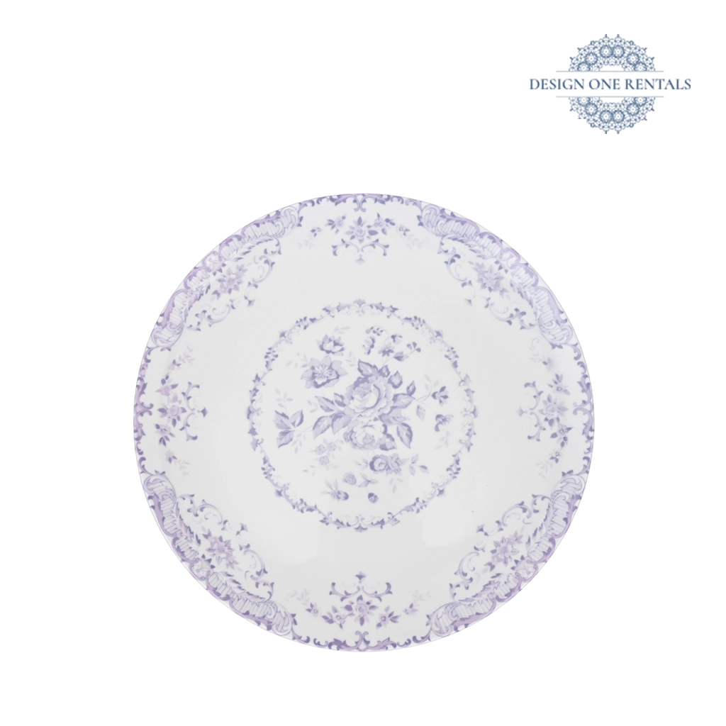 The Antique Lavender Charger Plate features a vintage floral design in soft lavender hues on a pristine white porcelain base. Delicate detailing along the rim and center adds an old-world charm that enhances romantic and timeless table settings. Ideal for weddings, tea parties, or elegant gatherings, this charger plate brings a refined and graceful touch to your event décor. Pair it with Luxe Clear Collection for a beautifully balanced tablescape.