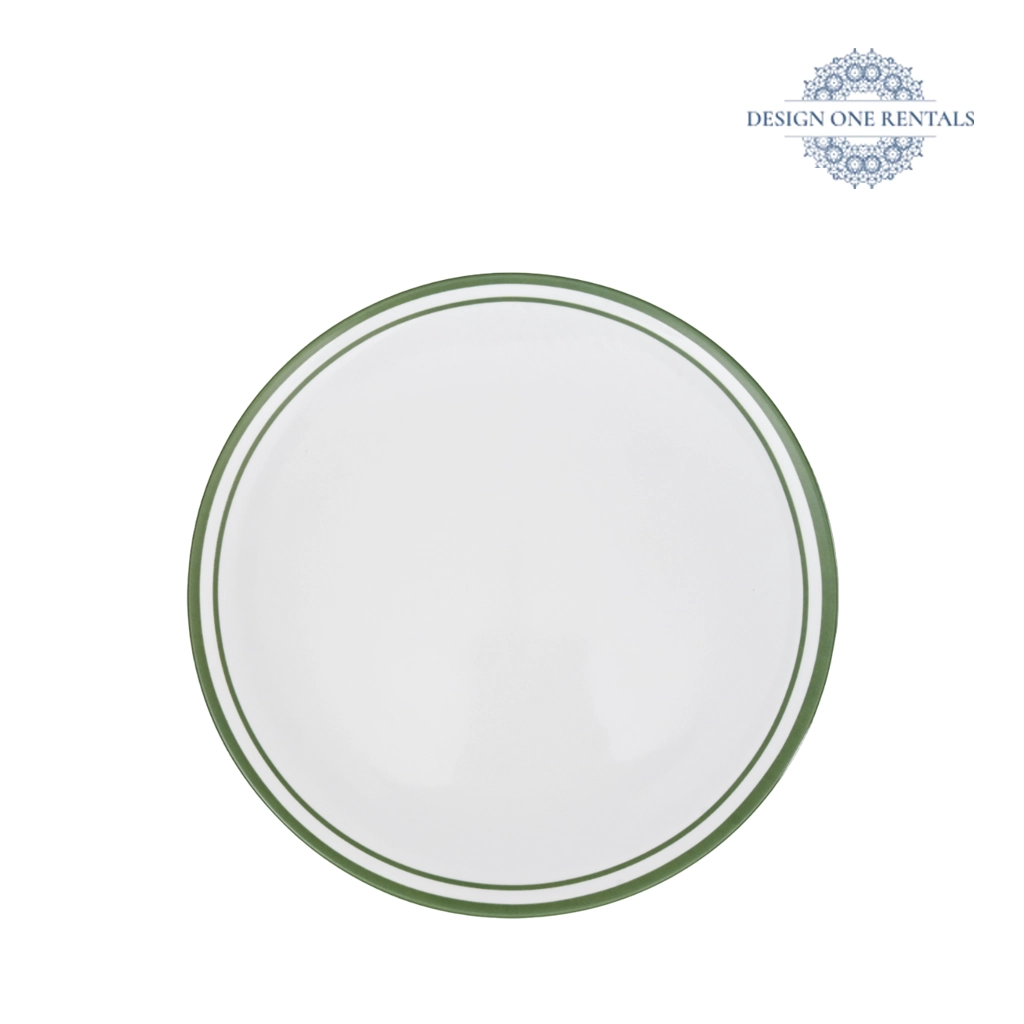 The Edge Verde Charger Plate features a crisp white base accented with dual green border rings for a clean, modern look. Its minimalist design blends natural charm with refined style, making it perfect for contemporary weddings, garden parties, or outdoor celebrations. This versatile plate pairs beautifully with our Hudson Stem Faint Green Collection. A stylish choice for event planners and party rentals aiming to create a fresh, polished tablescape.