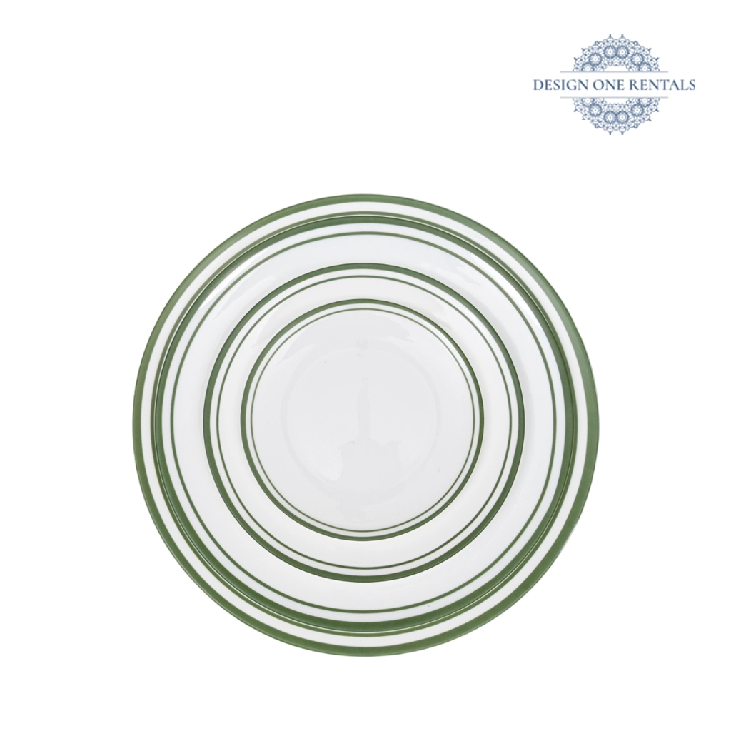 The Edge Verde China Set features a white center accented with evenly spaced green rings, creating a clean and modern look ideal for contemporary event styling. Available in multiple sizes, it pairs well with our Two Tone Black and Champagne Collection for fresh, refined table designs.