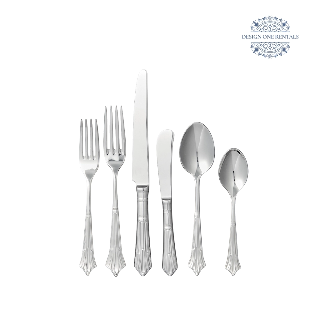 The Empire Stainless Collection features substantial flatware with classical, architectural detailing that brings a regal presence to formal tables, styled seamlessly with our Zenith Nero Collection dinner plates, Monte Carlo Gold Rim charger plate, and Power Stem Clear Collection glassware for formal weddings and traditional celebrations.