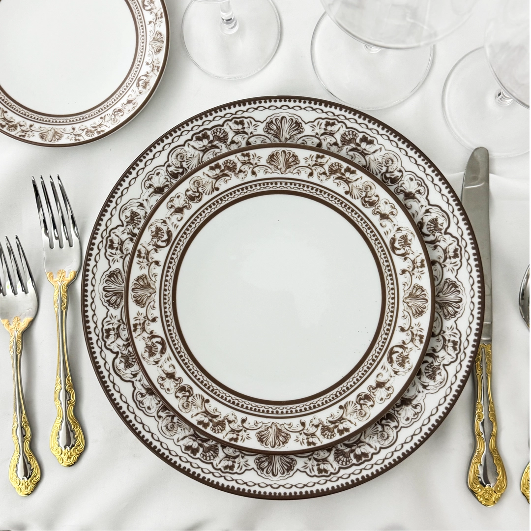 The Heritage China Set showcases a vintage-inspired brown pattern on crisp white china, featuring ornate scrollwork, floral details, and classic shell accents. Available in multiple sizes, this collection is ideal for event planners and party rentals seeking a traditional or old-world aesthetic for weddings, themed dinners, and refined celebrations. Its intricate artwork adds character and depth to each place setting, creating a richly styled tablescape. Pair it with our Irene Champagne Gold Collection to highlight its warm, historic charm.