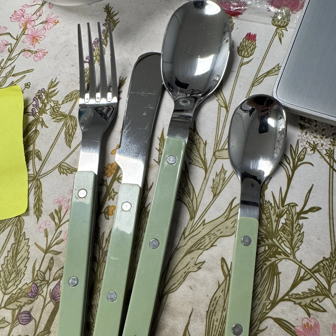 The Jennifer Collection flatware features vibrant sage green handles with polished stainless steel heads, perfect for casual brunches and pairs beautifully with our The Neutral Palm Collection dinner plates, Antique Light Green, or colorful tableware.