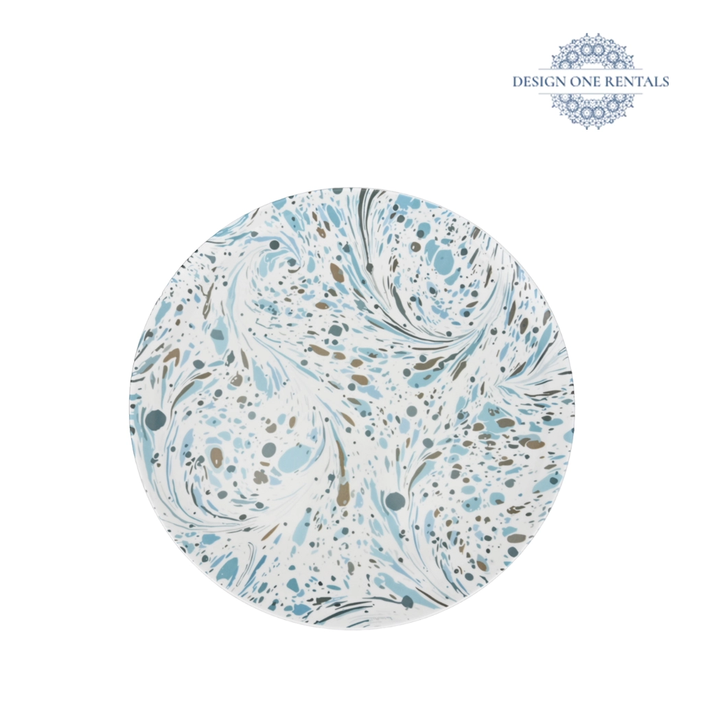 The MJ Azure Charger Plate features a mesmerizing marbled pattern in soothing shades of blue, gray, and white. Its hand-painted, ocean-inspired design brings a refreshing and artistic touch to modern, coastal, or contemporary-themed events. Perfect for event planners and party rentals, this charger adds depth and a serene atmosphere to any tablescape. Pair it with our Crystal Cut Clear Collection for a polished, ocean-chic look.