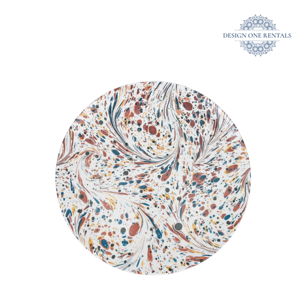 The MJ Earth Splash Charger Plate features a stunning marbled design in earthy hues of terracotta, navy, mustard, and cream. Its hand-painted, fluid pattern creates a natural, artistic look inspired by the beauty of stone and watercolor textures. Ideal for rustic, bohemian, or creative-themed events, this charger plate brings depth and visual interest to any tablescape. Pair it with our Flora Collection″ for a stylish, contemporary finish.