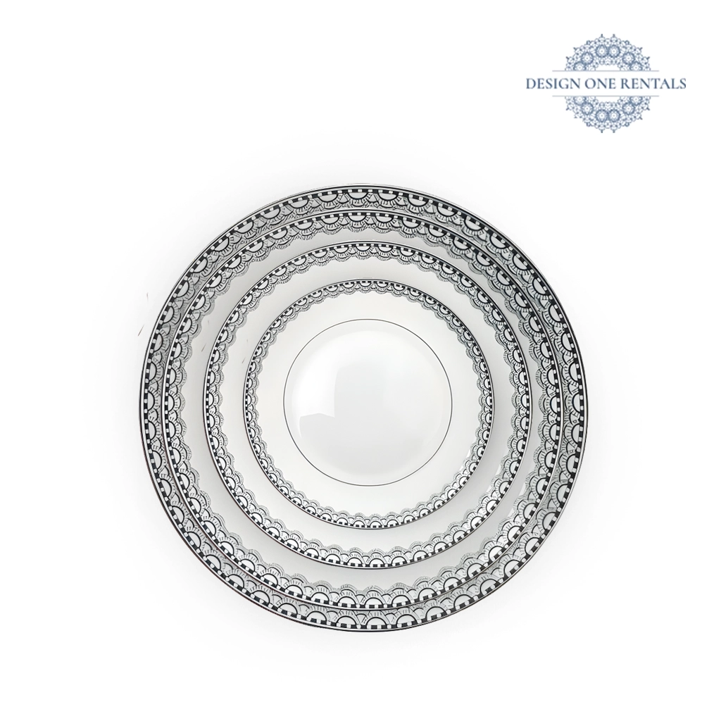 The Noble Silver Collection Dinner Plate features a lace-inspired black-and-white border with refined geometric detailing and a subtle silver accent. Ideal for black-tie events and modern formal tablescapes. Available in different sizes, this pair beautifully with our  The Aurora Stainless Silver Collection flatware and  Grace Clear Collection.