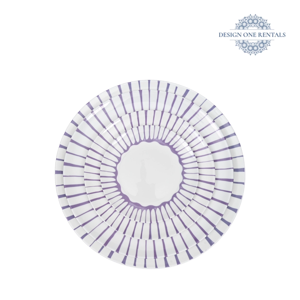 The Palmera Purple Collection dinner plate features bold, tapered purple stripes radiating from the rim toward a bright white center, creating a modern sunburst effect inspired by palm fronds. A softly scalloped purple border frames the center, adding visual contrast that works beautifully for spring luncheons, creative events, and contemporary party rentals. Available in multiple sizes, this plate offers flexibility for layered place settings and artistic table designs. Pair it with our Valencia Stainless Collection, and Artisan Clear Collection to complete the look.