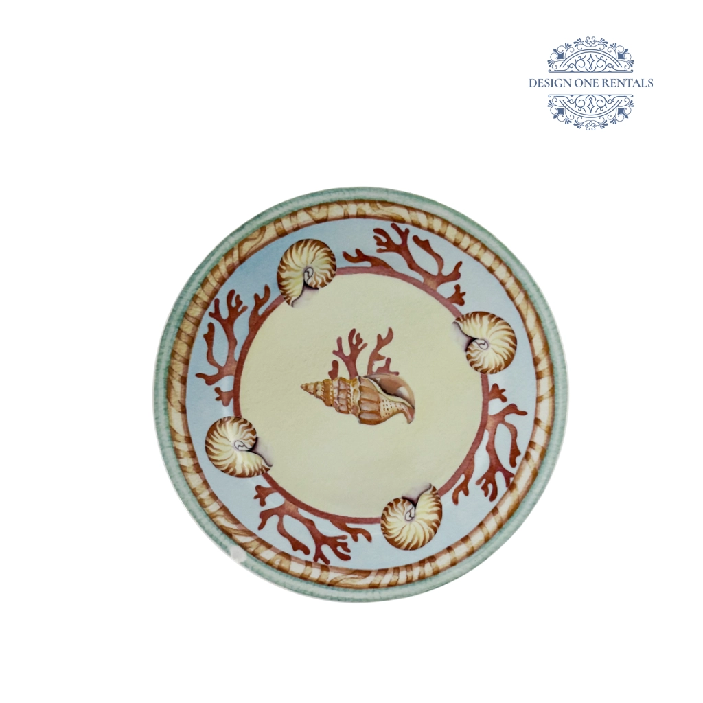The Seashell China Plate brings a coastal story to the table with a sandy-toned center featuring a detailed conch shell and red coral accent. A wide light blue border showcases repeating nautilus shells and coral motifs in warm terracotta and cream, finished with a rope-textured rim for a true nautical touch. This plate is ideal for beach weddings, summer parties, seaside dinners, and themed event rentals that call for a relaxed ocean-inspired setting. Pair it with our Honey Rattan for a balanced tablescape.