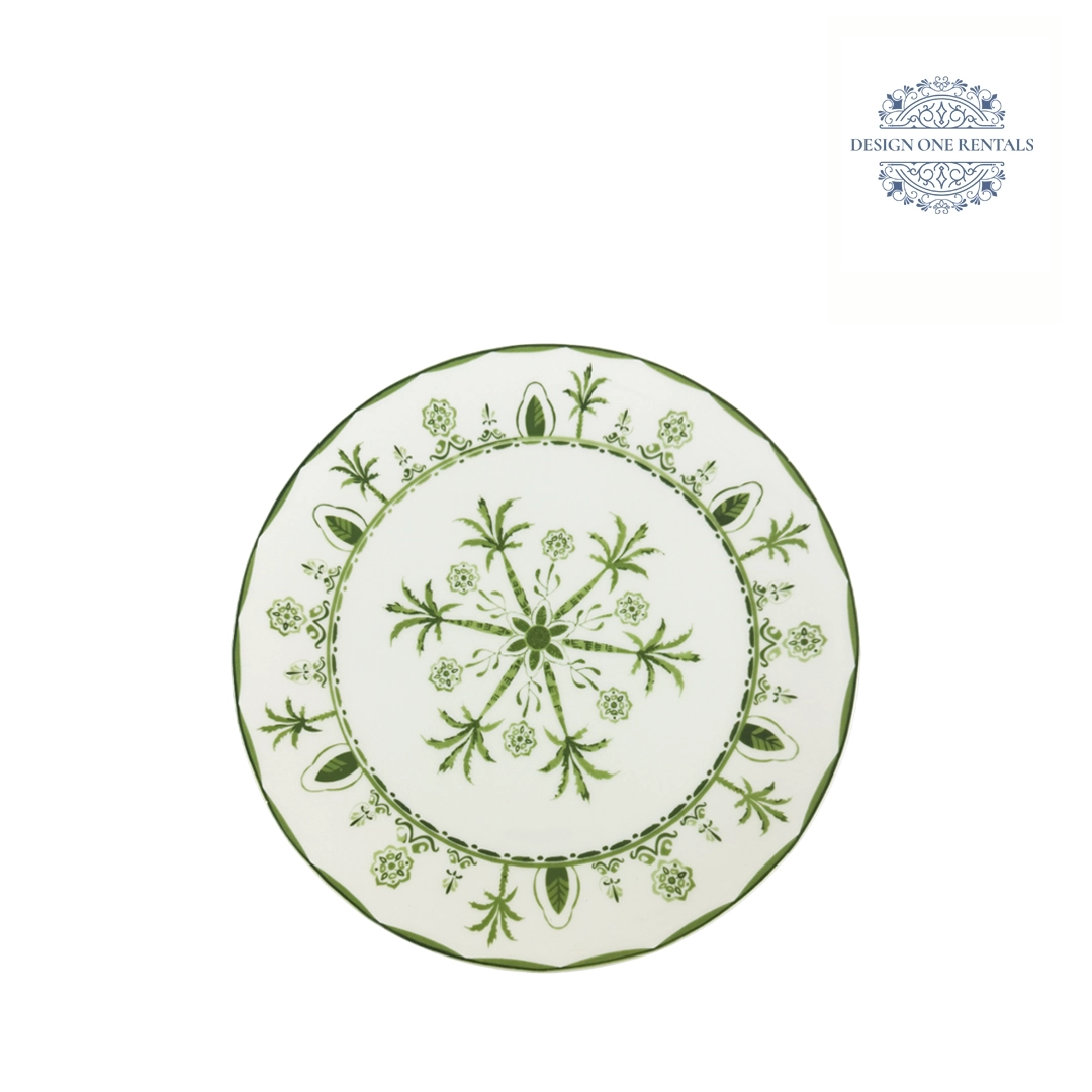 The Sultan Charger Plate showcases an intricate design featuring six curved branches radiating from the center, framed by a lush green border of flowers, fruits, and leaves. Its detailed, star-like pattern brings a touch of artistry and sophistication to wedding receptions, themed events, and fine dining setups. Crafted for party rentals, this charger plate adds depth and visual interest to any tablescape. Best paired with Aimee Gold Collection, crystal glassware, and gold flatware to create a harmonious and refined table setting.