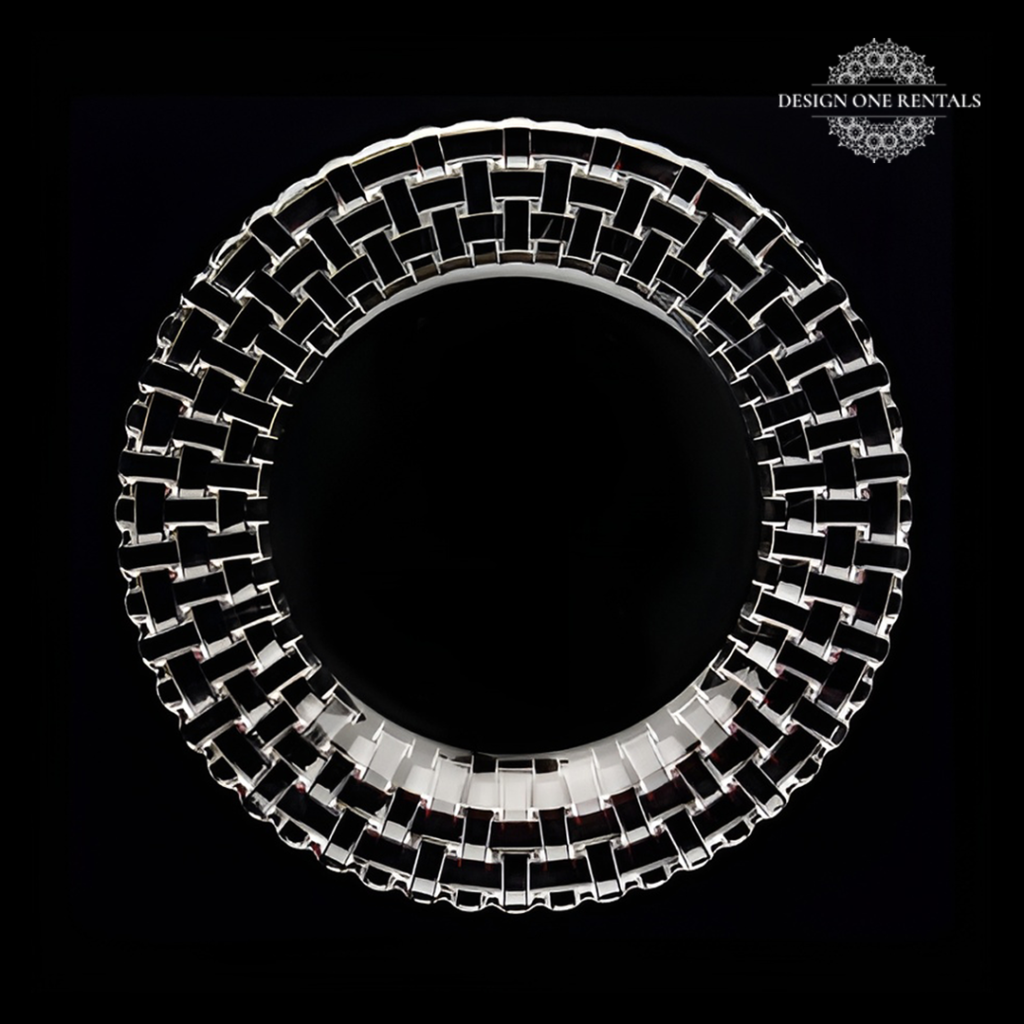 The Vetri Charger Plate showcases a bold woven lattice rim crafted from reflective silver-toned material, offering a modern and luxurious appeal. Its interlocking geometric design and glossy finish create depth and visual interest, making it a standout piece for sophisticated events or contemporary themes. Perfect for galas, weddings, or corporate gatherings, this charger adds a polished metallic touch to any tablescape. Pair it best with Roxbury Gold Collection for a refined modern look.