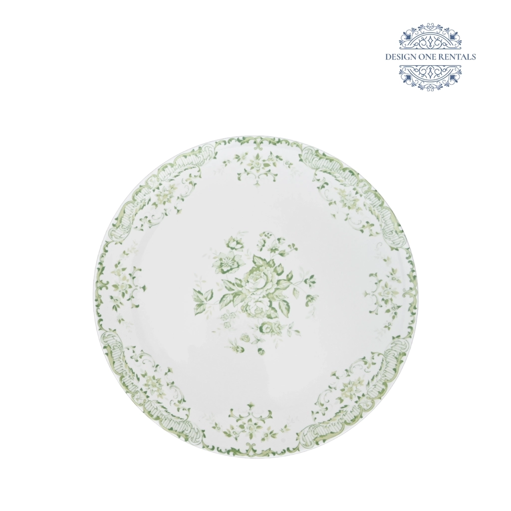 The Antique Verde Charger Plate showcases a timeless floral pattern in soft sage green set against a crisp white background. Intricate vines, blossoms, and scroll motifs frame the center, creating a refined vintage appeal that suits romantic weddings, garden celebrations, or classic-themed events. Its graceful design pairs beautifully with our Elyse. A perfect choice for event planners seeking a touch of antique-inspired charm for any tablescape.