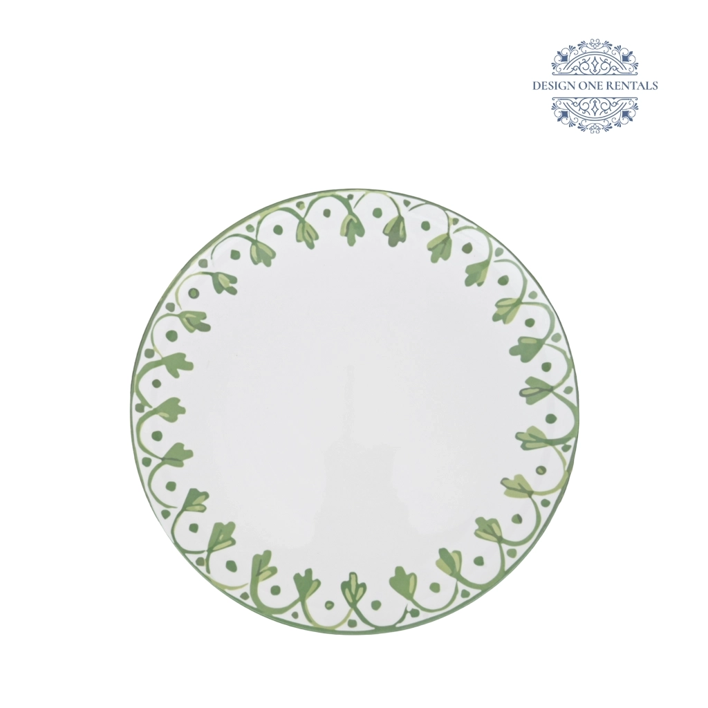 The Linea Verde Charger Plate showcases a crisp white base accented with a soft green vine pattern delicately wrapping around the rim. Its leafy design brings a touch of natural charm and refinement, making it ideal for weddings, outdoor celebrations, or garden-inspired events. Versatile and timeless, this charger pairs beautifully with our Deco Silver 10″ A perfect choice for event planners seeking a fresh, nature-inspired accent for their tablescapes.