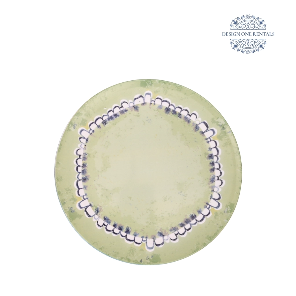 The Panna Verde Charger Plate showcases a hand-painted design on a soft green base, accented with white and deep indigo details for an artisanal, vintage-inspired look. Its subtly distressed finish and delicate circular motif bring warmth and character to any tablescape. Perfect for outdoor luncheons, rustic weddings, or nature-themed events, this charger plate pairs beautifully with our The Parma Gold Collection. A timeless choice for event planners looking to add charm and artistry to their settings.