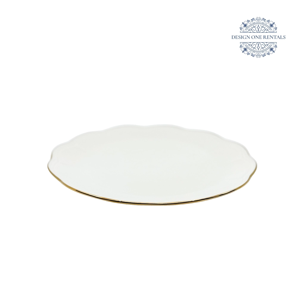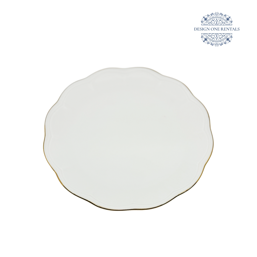 The Monte Carlo Gold Rim Charger Plate features a soft white surface with a delicate scalloped edge outlined by a fine gold rim. Its refined design brings a touch of sophistication to weddings, banquets, and upscale gatherings. Perfect for event planners and party rentals, this charger plate pairs beautifully with our Timeless Thick Gold Band Collection for a polished table presentation. A timeless choice that complements both modern and classic event themes.
