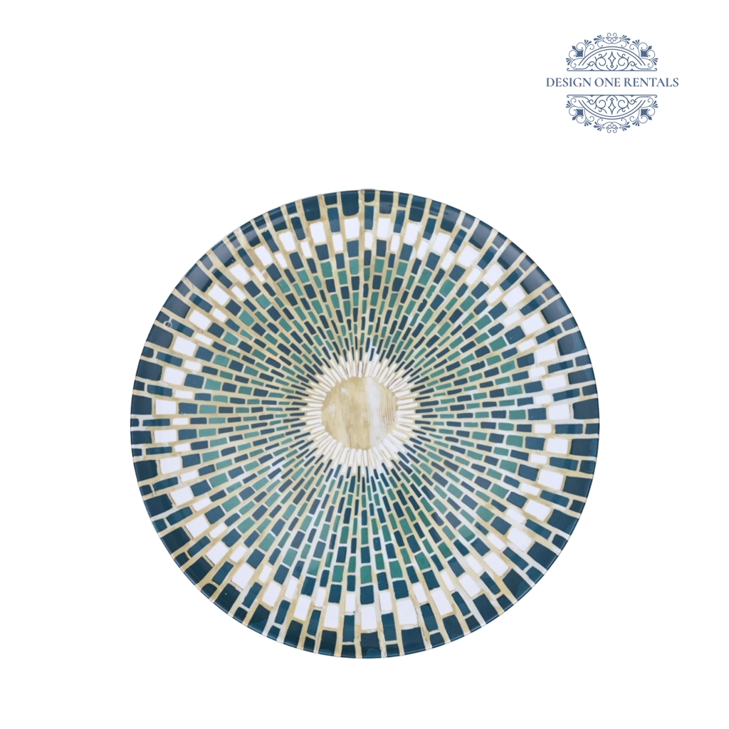 The Mosaic Charger Plate showcases a stunning sunburst design made from green, white, and gold mosaic-style tiles that radiate from the center. Its geometric pattern brings texture and artistry, making it a standout choice for tropical-inspired, modern, or upscale event themes. Perfect for event planners and rental setups, this charger adds a touch of color and sophistication to any tablescape. Pair it beautifully with our Antique Faint Green for a polished and vibrant table presentation.