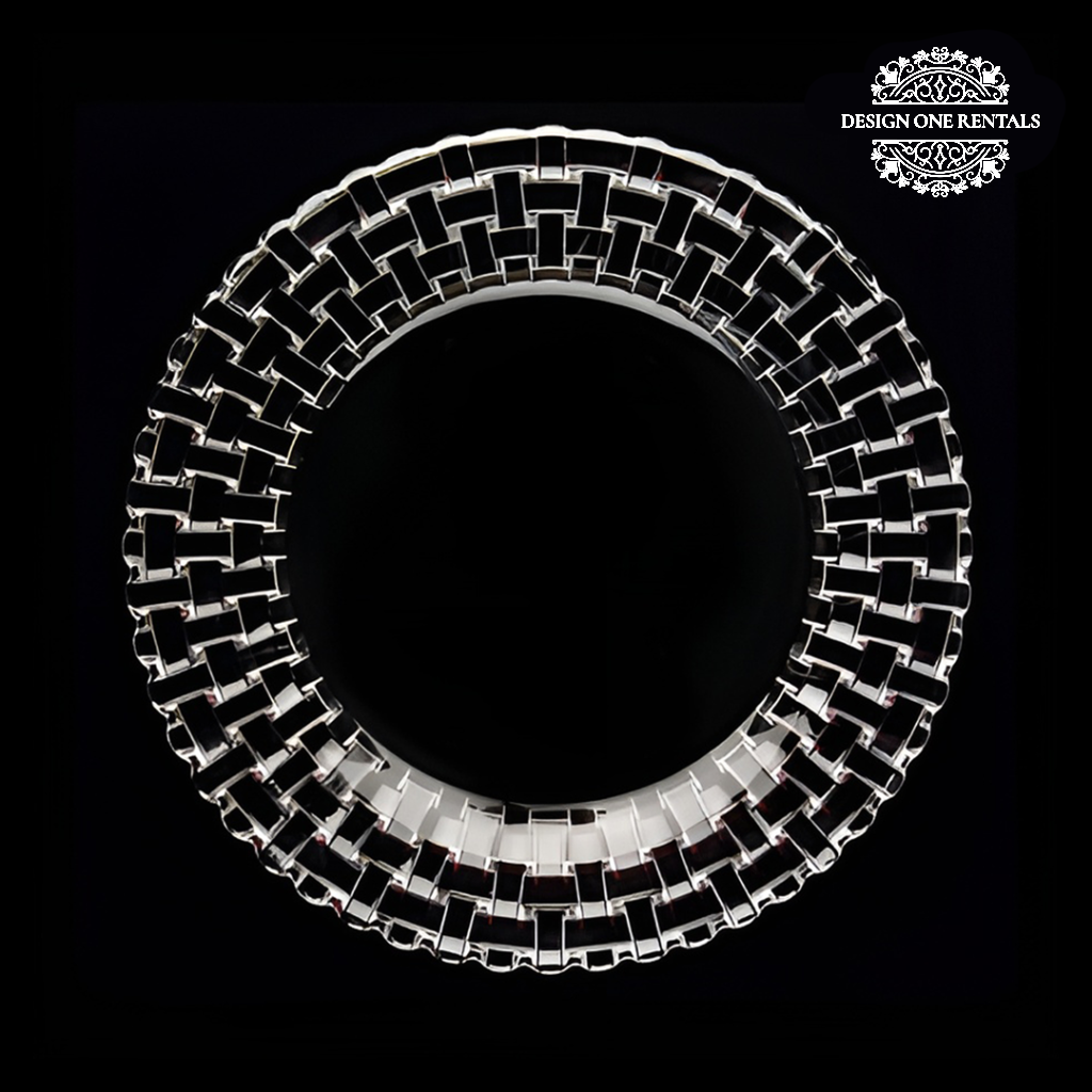 The Vetri Charger Plate showcases a bold woven lattice rim crafted from reflective silver-toned material, offering a modern and luxurious appeal. Its interlocking geometric design and glossy finish create depth and visual interest, making it a standout piece for sophisticated events or contemporary themes. Perfect for galas, weddings, or corporate gatherings, this charger adds a polished metallic touch to any tablescape. Pair it best with Roxbury Gold Collection for a refined modern look.
