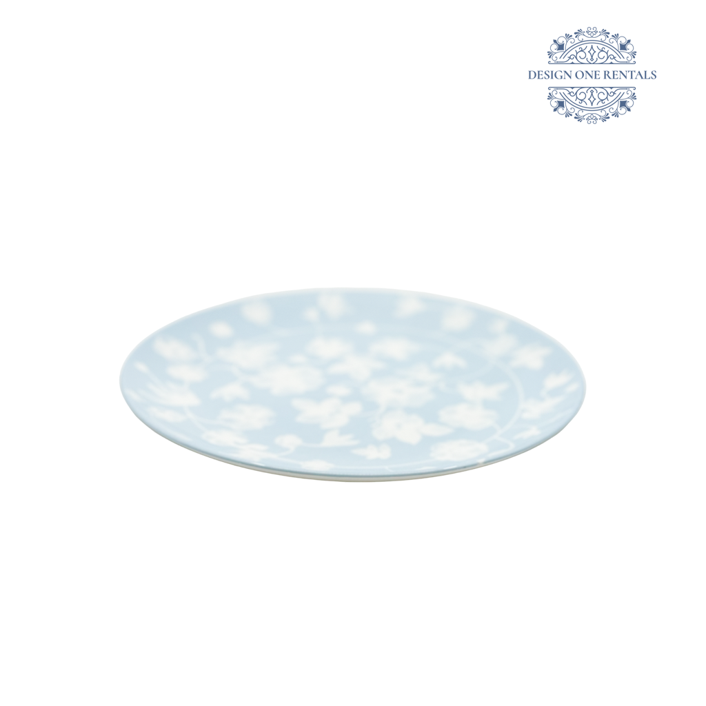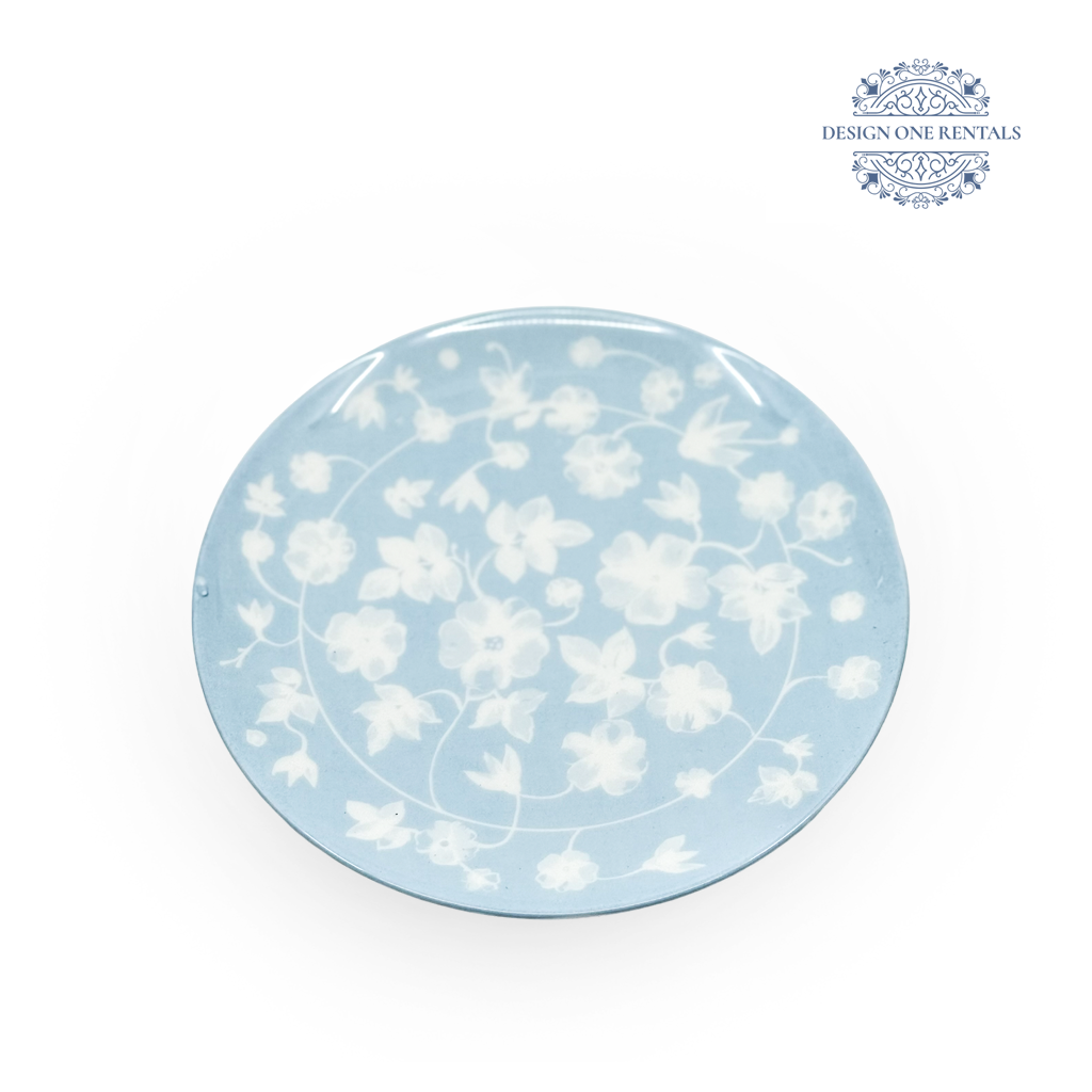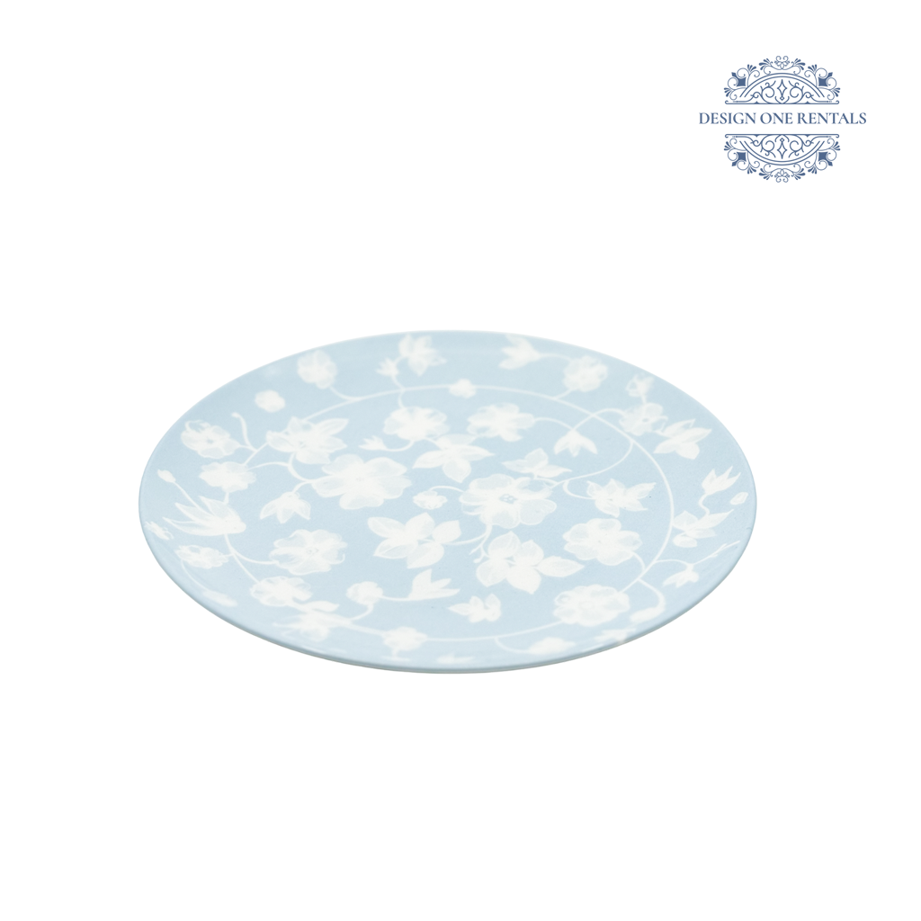 The Aria Light Blue China Plate features a soft powder-blue base adorned with airy white florals and trailing leaves arranged in a flowing, watercolor-style pattern. Its light, botanical design makes it a beautiful option for garden weddings, spring luncheons, bridal showers, and styled party rentals. Available in different sizes, this plate allows event planners to layer place settings with gentle color and visual interest. Pair it with our Ethan Brushed Gold Collection for a balanced table design.