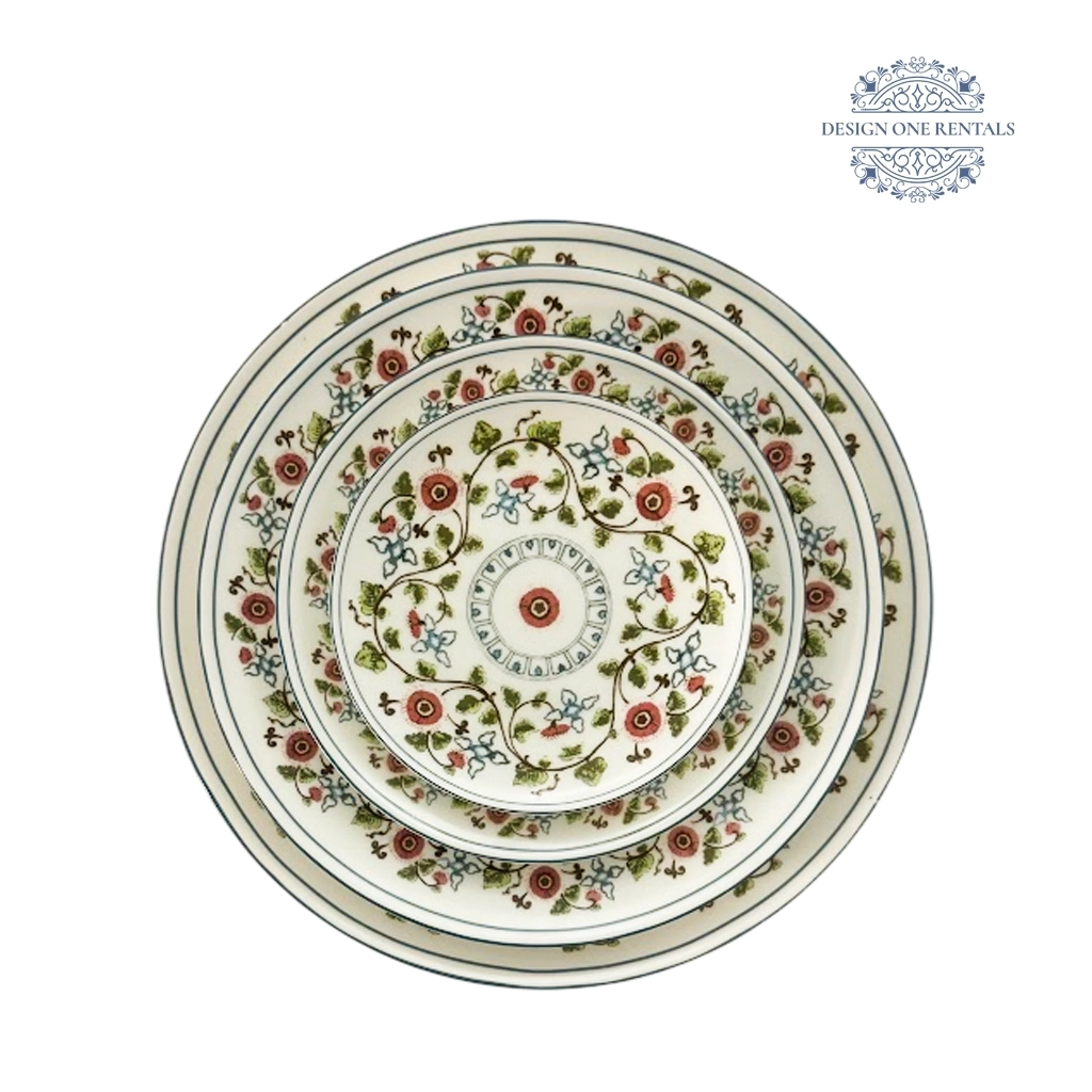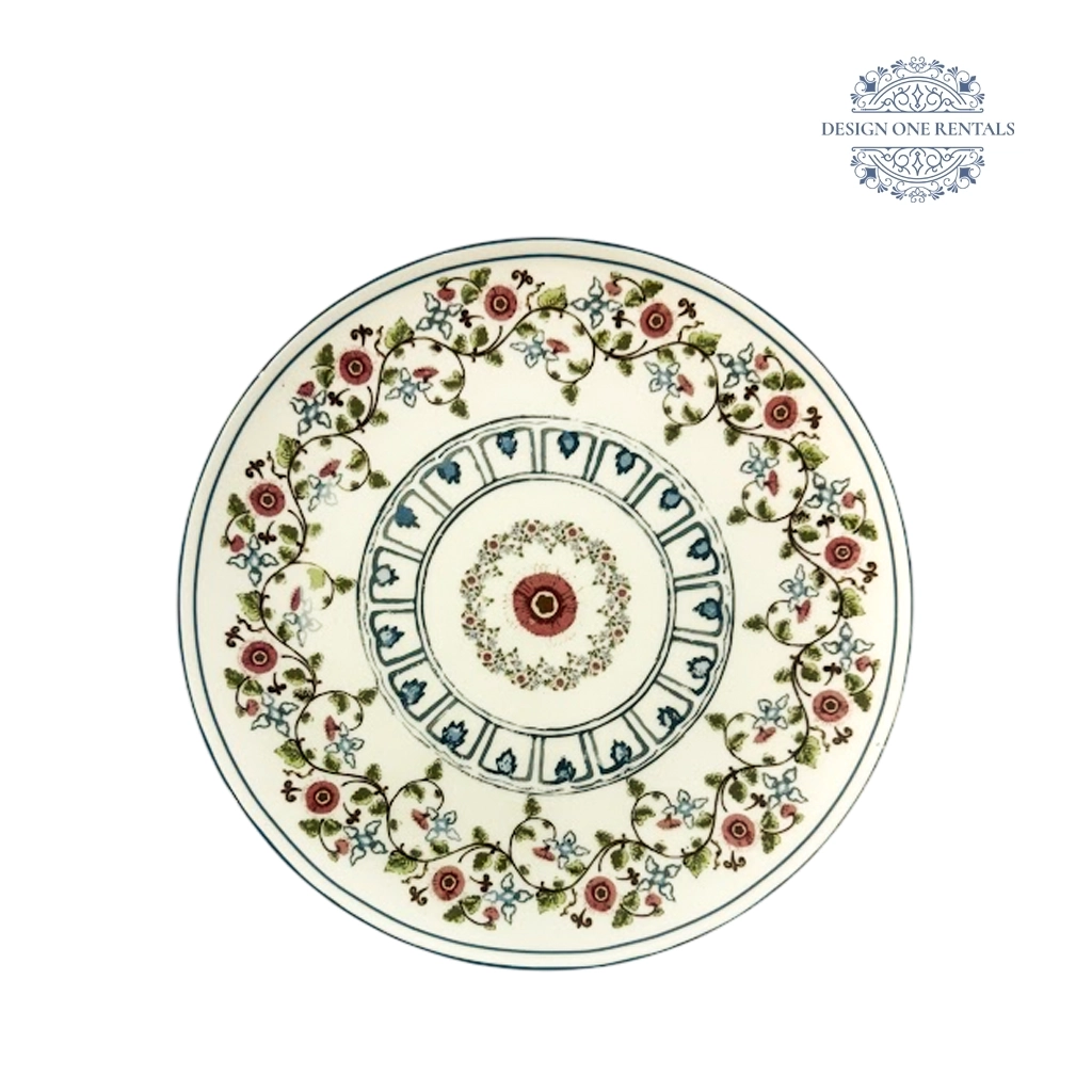 The Elie Collection features porcelain plates with hand-painted botanical vines, blue pinstripe rims, and soft pink and sage accents, available in multiple sizes, ideal for garden weddings, spring events, and upscale rental tables, styled with Ethan Brushed Gold flatware, Power Stem Clear glassware, and white or pastel linens for garden weddings, outdoor receptions, and spring celebrations.