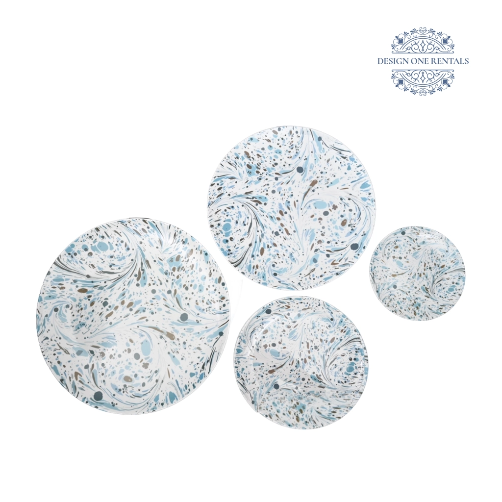 The MJ Azure Splash Collection China Plate features a bold, artistic marbled design with flowing swirls of azure, charcoal, and sandy brown. Its abstract splash pattern creates a dynamic visual, making each plate feel like a one-of-a-kind statement for creative tablescapes. Ideal for modern events, art-inspired weddings, and curated party rentals, this plate adds movement and visual interest to any setting. Available in multiple sizes, it pairs well with Valencia Stainless Collection or smoke chargers, and minimalist glassware.