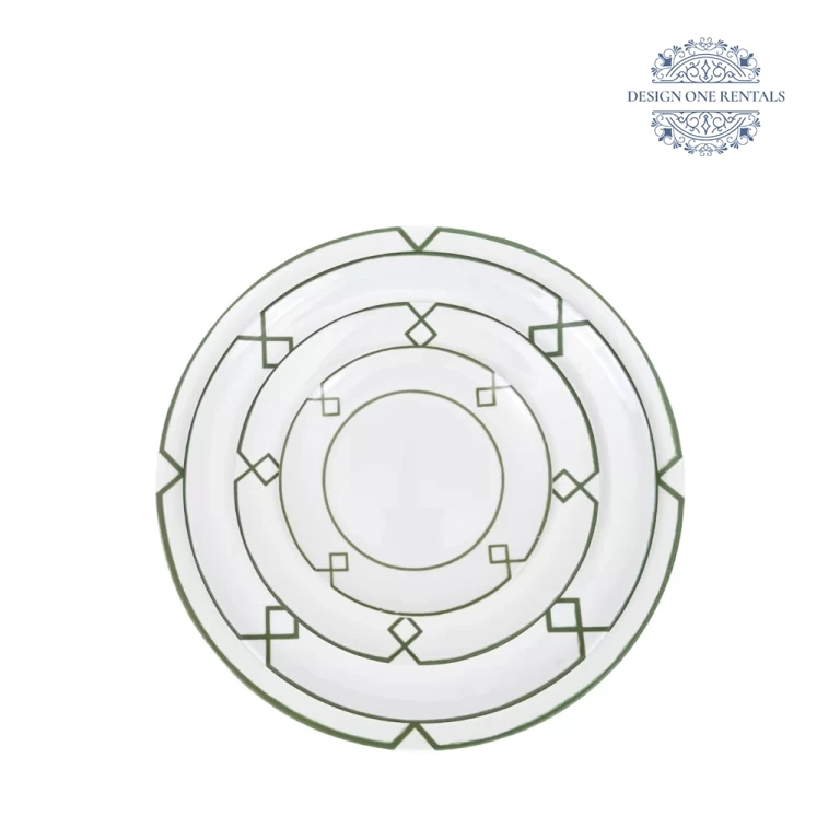 The Zenith Verde China Set features a bold geometric design with concentric circles and angular motifs of squares and diamonds accenting the rim. Its structured pattern brings a modern, striking look that works beautifully for contemporary events, themed celebrations, and stylish party rentals. Available in multiple sizes, this set allows event planners to build layered table settings with a clean, graphic aesthetic. Pair it with our Crystal Cut Clear Collection to enhance its sharp, modern character.