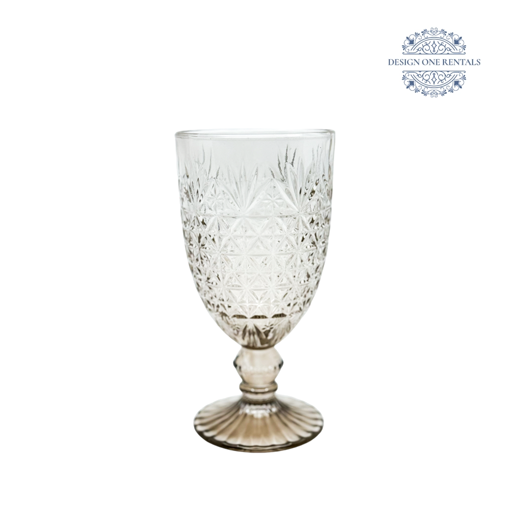 The Artisan Smoke Glassware features a vintage-inspired goblet with a smoke-grey gradient that deepens toward the base, detailed with pressed diamond and starburst patterns and soft feathered etching near the rim, supported by a decorative stem and fluted radial base, styled with Allora Silver flatware, Midnight Rim Dinner Plates for modern and monochromatic table settings.