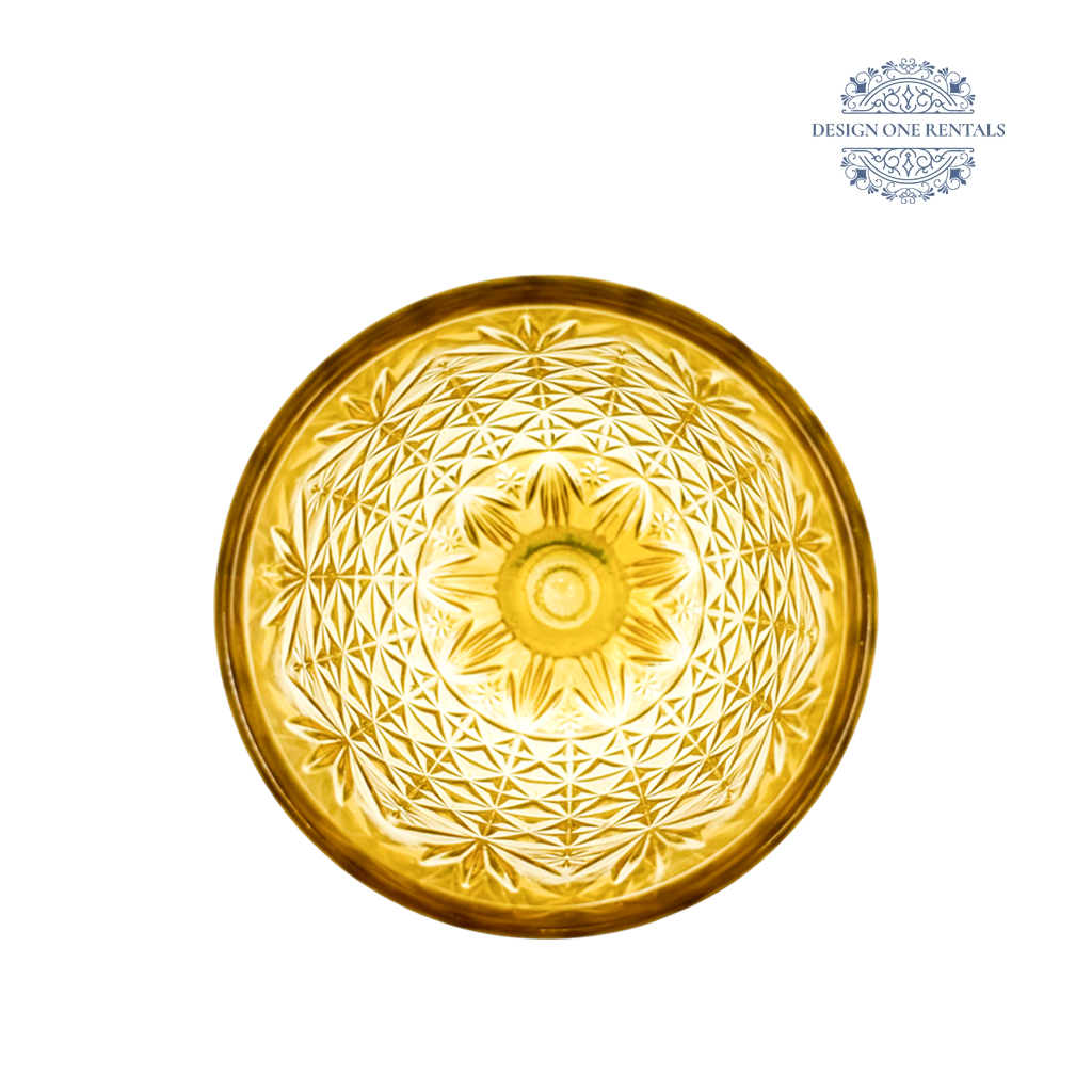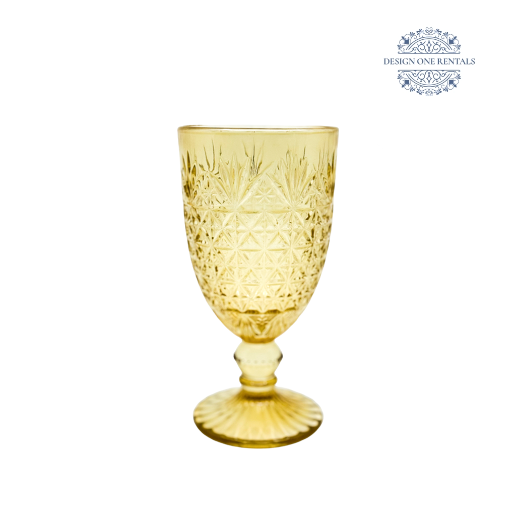 The Artisan Yellow Glassware features vibrant golden pressed glass with a diamond-grid texture and starburst fan details, finished with a baluster-style stem and radial-ribbed base, styled with ehtan flatware, and sigal dinner plates for warm, vintage-inspired table settings.