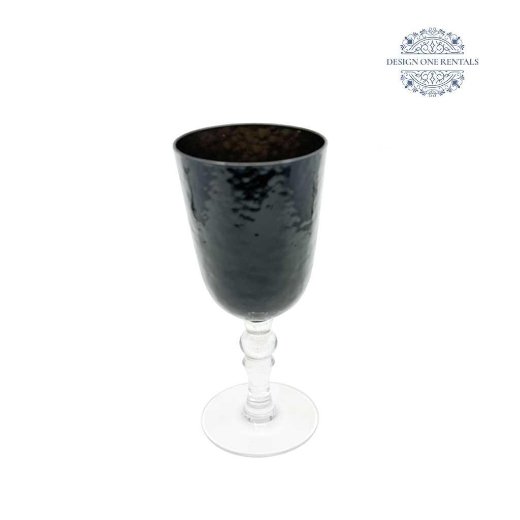 The Athena Nero Glassware features an opaque obsidian-black hammered bowl with a clear glass stem detailed with multi-tiered beads and a polished circular base, styled with jessica gold flatware, Chloe Clear chargers, and celine golddinner plates for modern and high-contrast table settings.