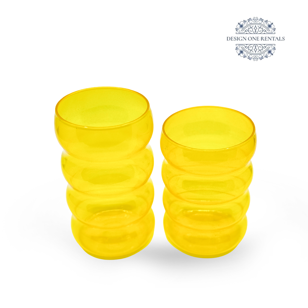 The Bubble Yellow Glassware features translucent sunny-yellow tumblers with three stacked rounded tiers and a clean rimless top, styled with Sigal Dinner Plates, Parma Gold flatware, and clear or acrylic chargers for summer parties, brunch gatherings, and bright table settings.