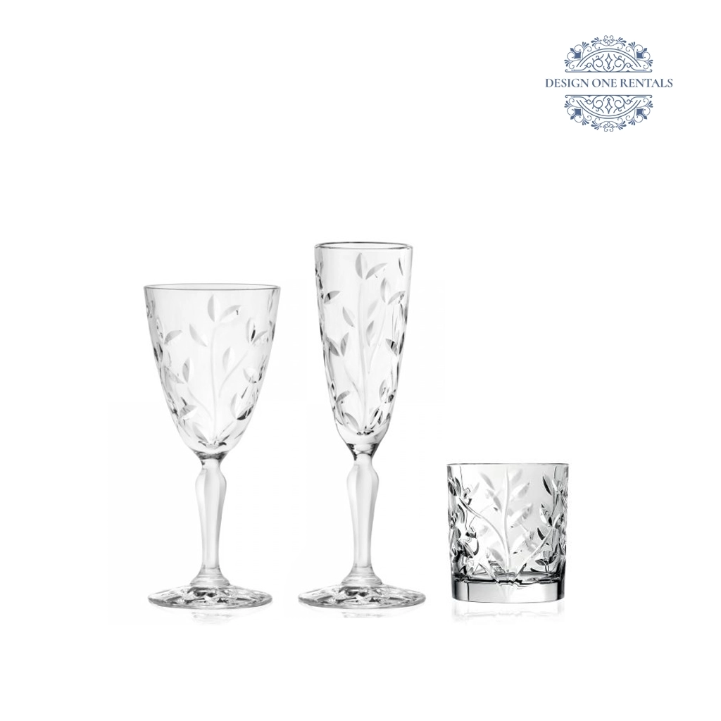 The Collette Collection features clear glassware etched with flowing leaf and vine motifs, bringing a romantic, vintage feel to the table and styled beautifully with our Classic plates, Parma Silver flatware, and Midnight Rim charger for modern events.