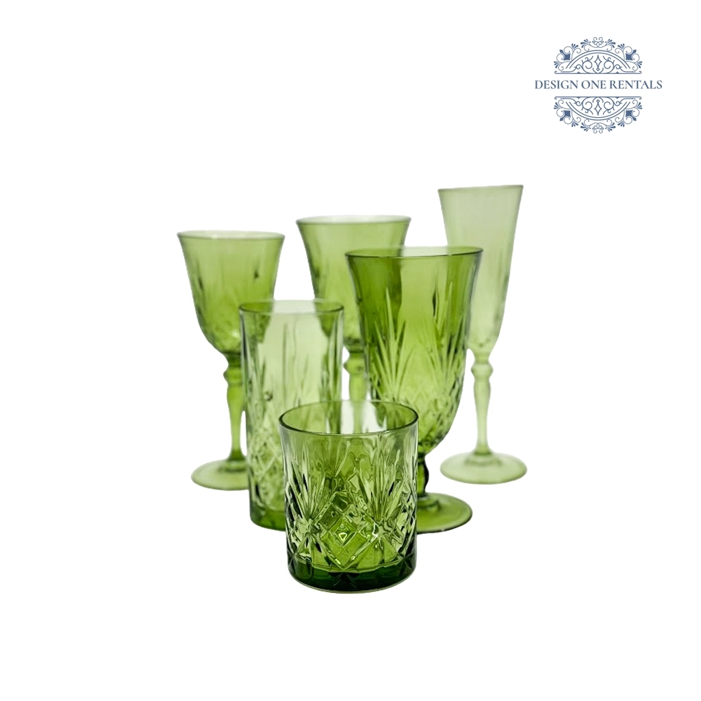The Crystal Cut Faint Green Collection showcases a soft moss-green tint with diamond and vertical crystal cuts across highballs, tumblers, wine goblets, and champagne flutes, styled with The Antique Verde plates, Allora Champagne flatware, and Laguna Rattan charger for garden weddings, spring events, and classic receptions.