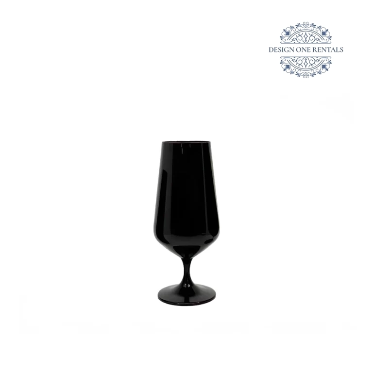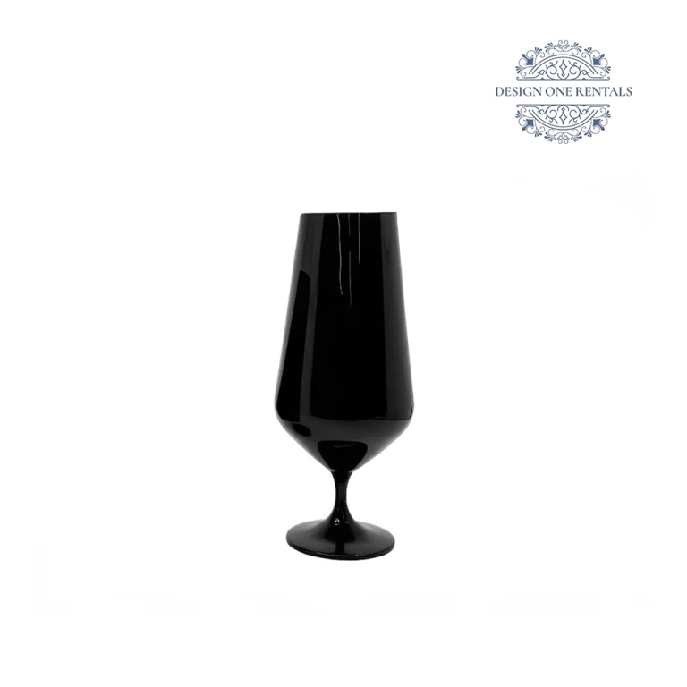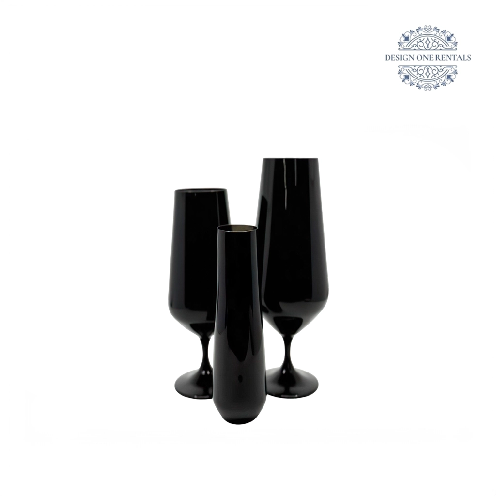 The Sandra Nero Collection features a stemless flute and tulip-shaped goblets in a deep opaque black finish with mid-century inspired silhouettes. Style it with Zenith Nero dinner plates, Two Tone Black and Champagne flatware, Midnight Rim Charger Plate, and dark linen napkins for modern events and formal tablescapes.