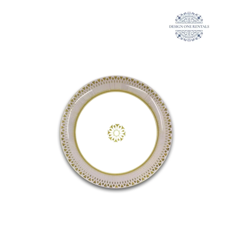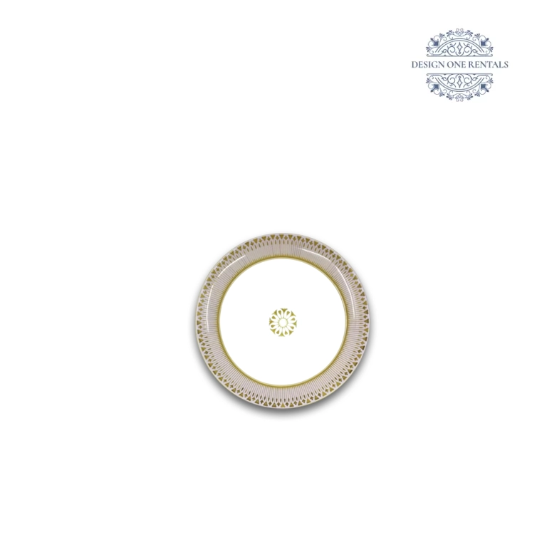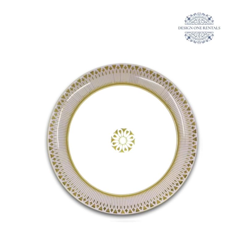 The Paris Lilac Collection features tiered plates with sunburst lilac striations, crown-like gold geometric bands, and a fine metallic rim, styled with Allora Champagne flatware, Crystal Cut Clear glassware, and ivory or blush linens for luxury weddings, engagement parties, and formal galas.